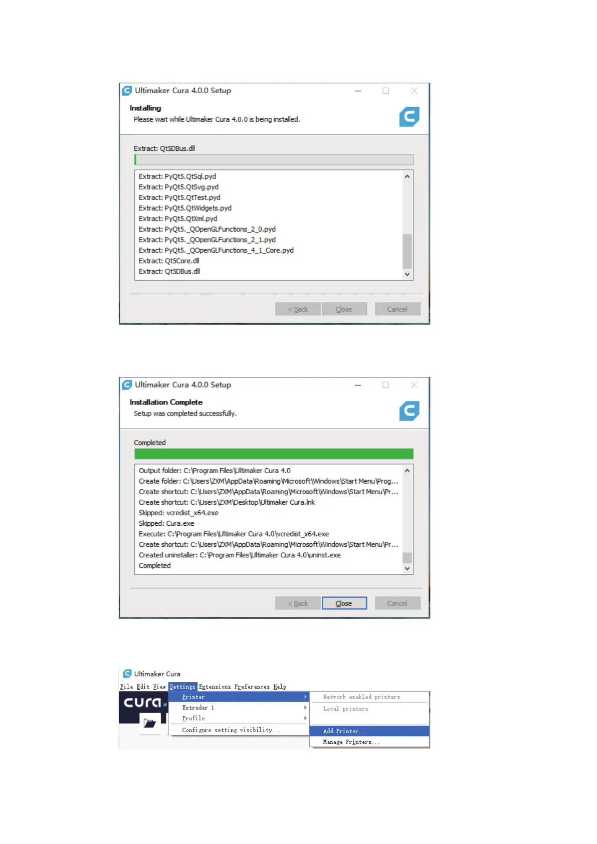 5. Click Close to complete the installation and launch the Cura program.