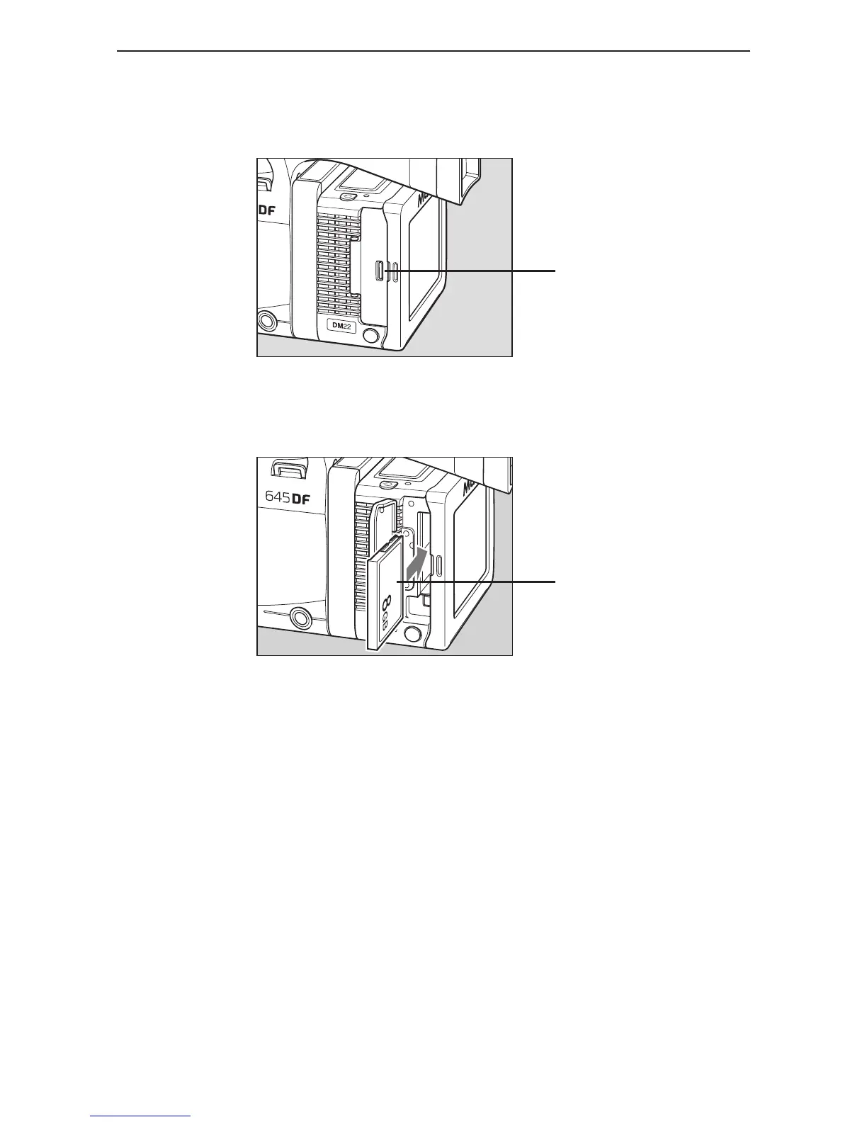 Mamiya 645DF - INSERTING AND REMOVING THE COMPACT FLASH CARD; Compact Flash Card Slot Access; Compact Flash Card Insertion Guide