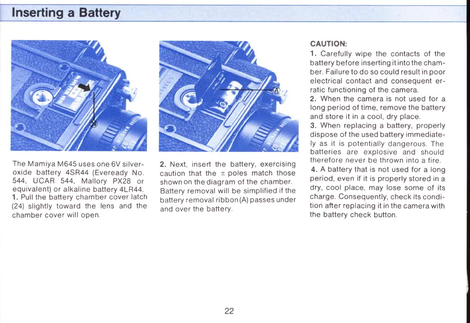 Mamiya M645 - Inserting a Battery; Insert the battery; CAUTION