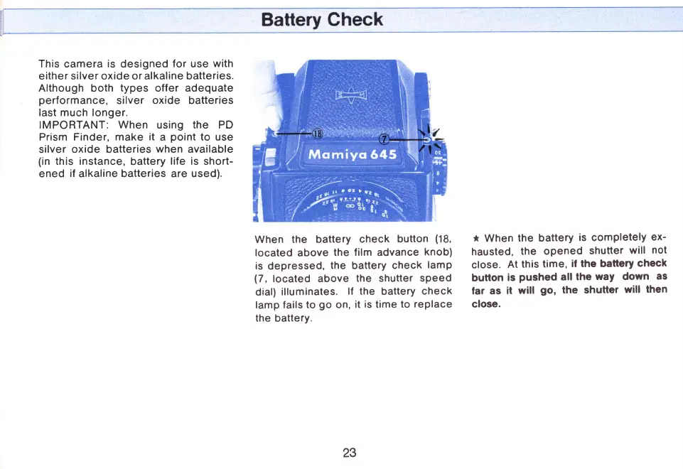 Mamiya M645 - Battery Check; Battery check button; Battery check lamp