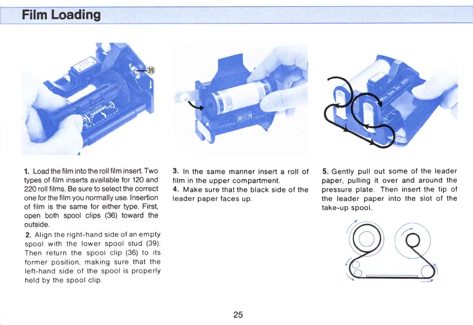 Mamiya M645 - Film Loading; Load film into insert; Insert film in upper compartment; Pull leader paper to take-up spool