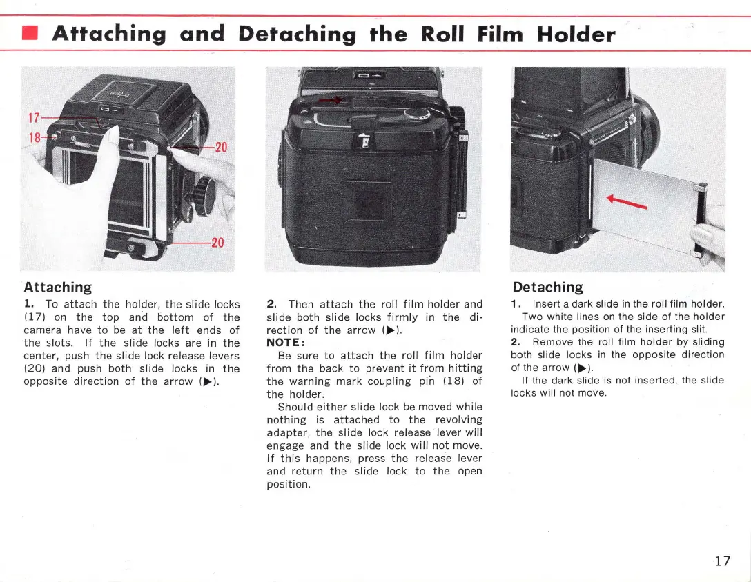 Mamiya RB67 - Attaching and Detaching the Roll Film Holder; Attaching the Roll Film Holder; Detaching the Roll Film Holder