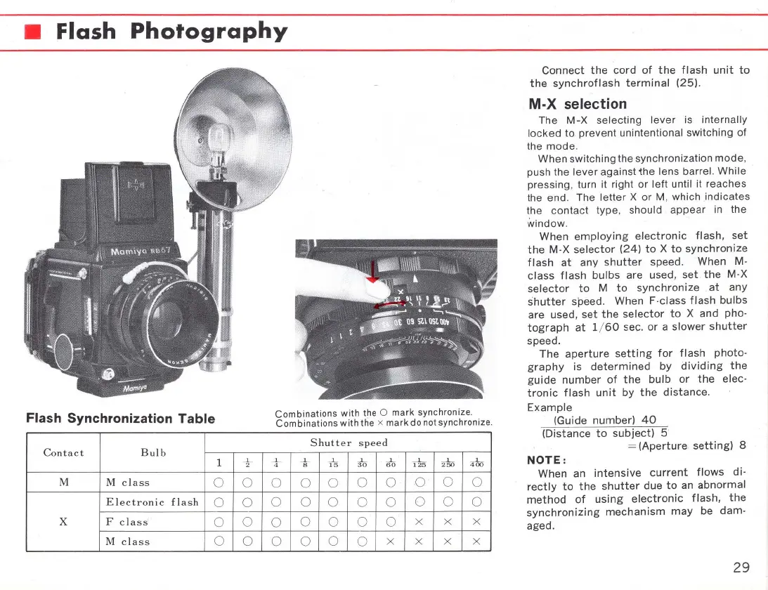 Mamiya RB67 - Flash Photography; Connecting Flash and M-X Selection; Synchronization Table and Aperture Setting