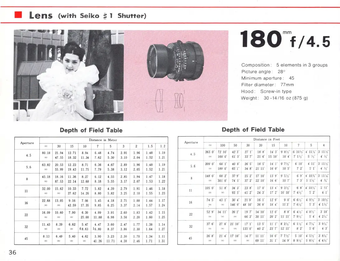 Mamiya RB67 - 180 mm f;4.5 Lens Details; 180 mm f;4.5 Specifications; 180 mm f;4.5 Depth of Field