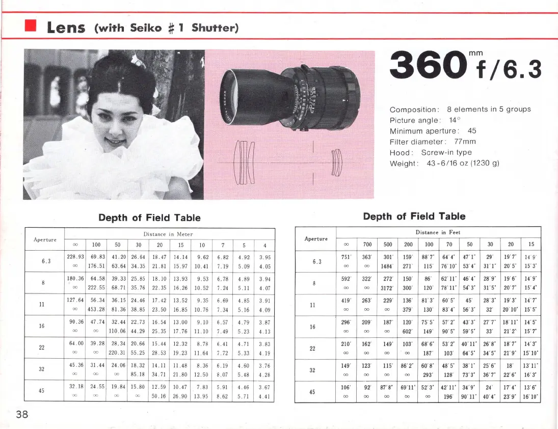 Mamiya RB67 - 360 mm f;6.3 Lens Details; 360 mm f;6.3 Specifications; 360 mm f;6.3 Depth of Field