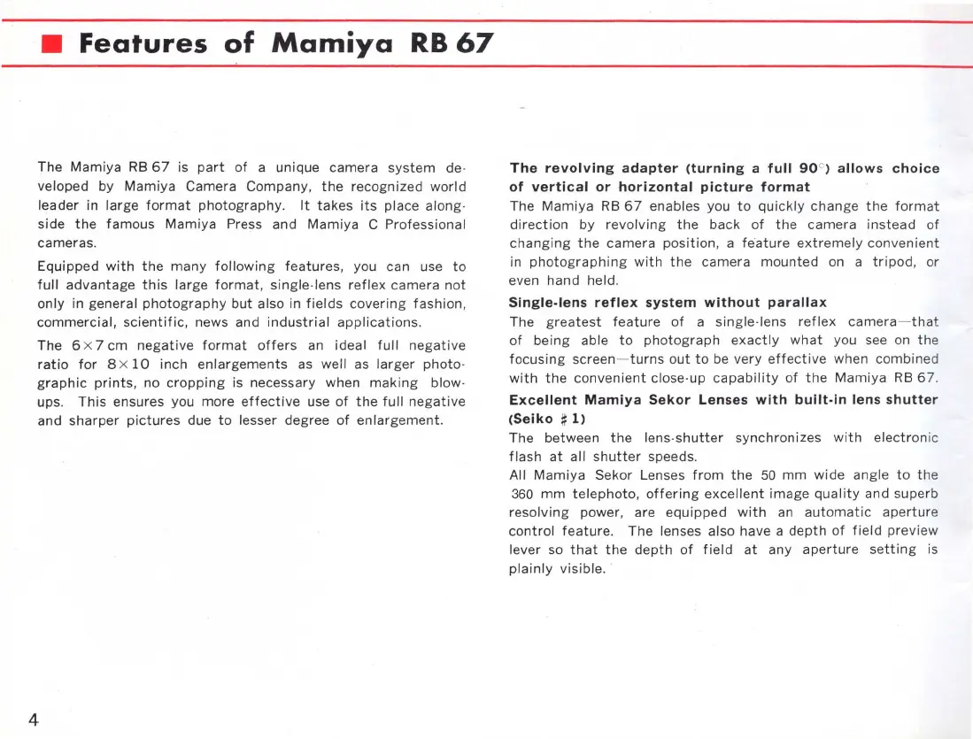 Mamiya RB67 - Features of Mamiya RB 67; Revolving Adapter Functionality; Single-Lens Reflex System Benefits; Mamiya Sekor Lenses with Built-in Shutter