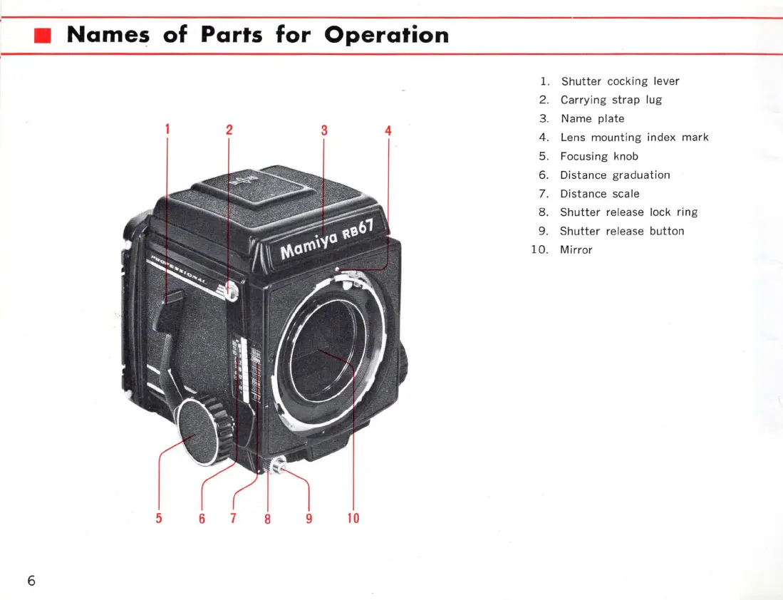 Mamiya RB67 - Camera Body and Component Identification; Front and Side Controls