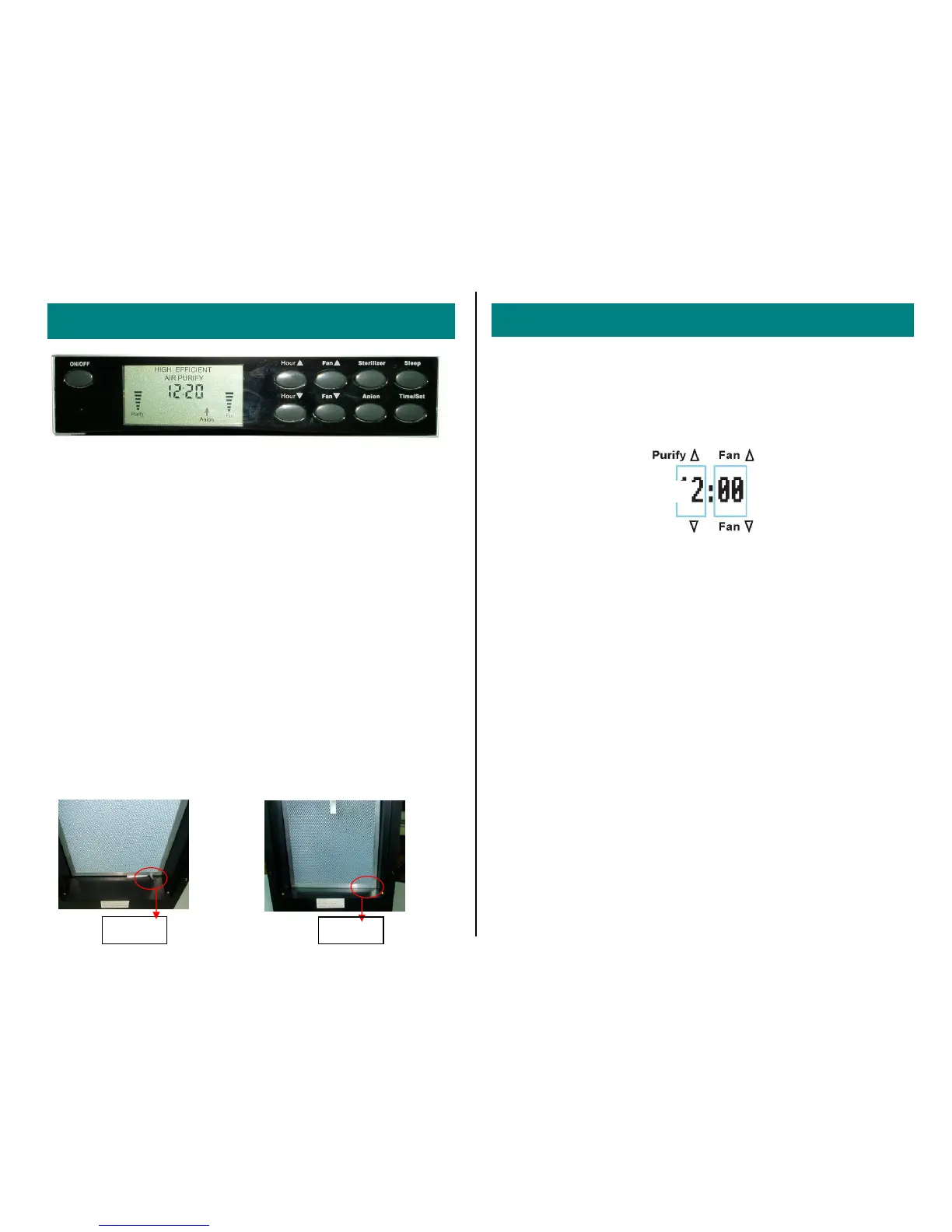 “Purify” and “Fan” controls to set desired hour and minute per previous