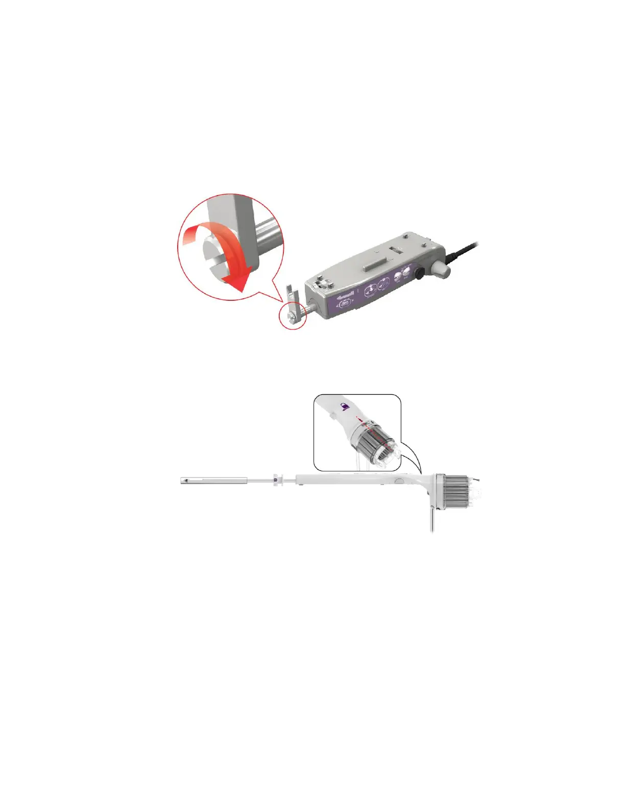 f. To attach, align the needle hub, press down, and forward. Do not force. Take care to avoid pinching