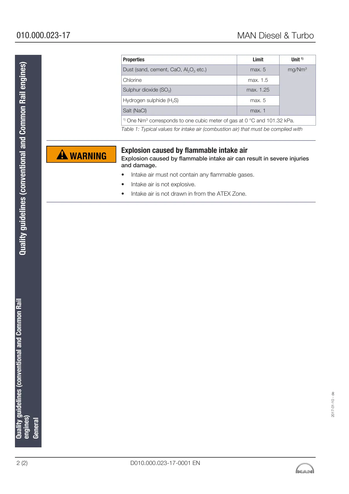 Table 1: Typical values for intake air (combustion air) that must be complied with