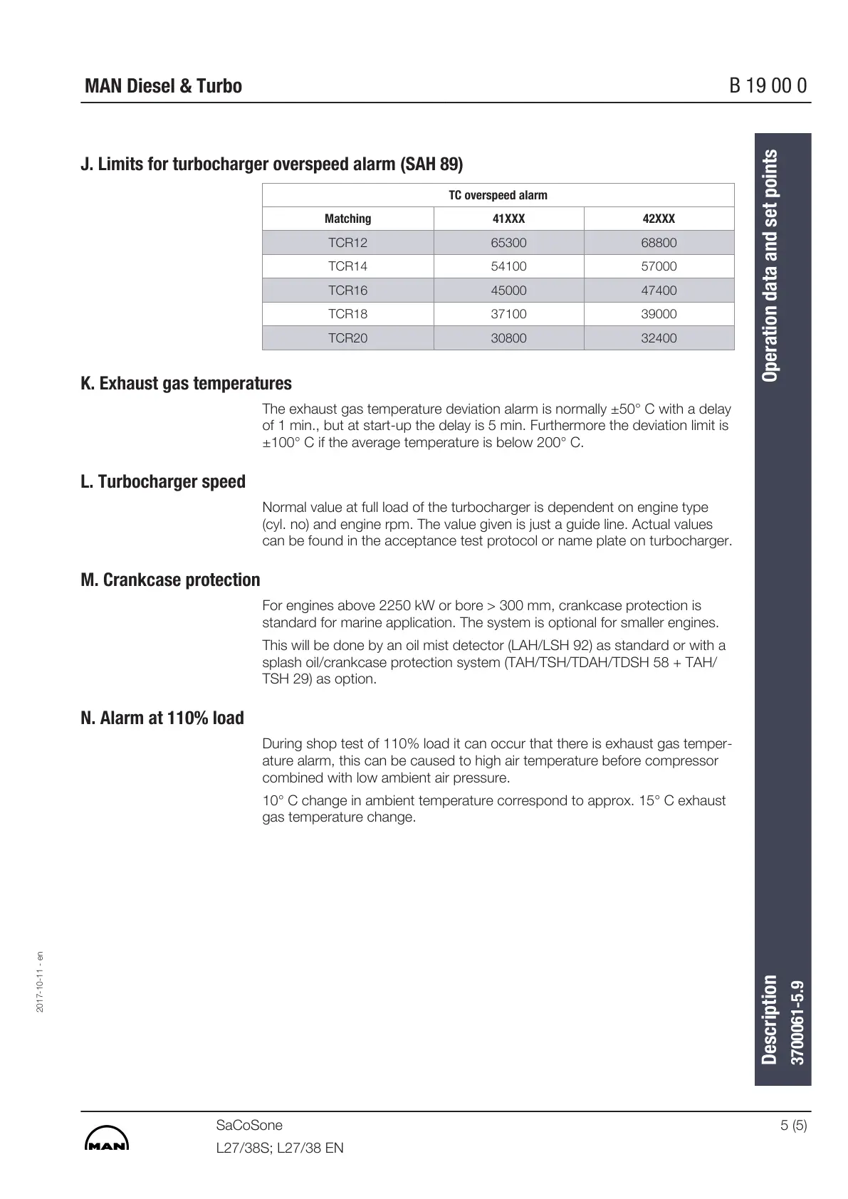 J. Limits for turbocharger overspeed alarm (SAH 89)