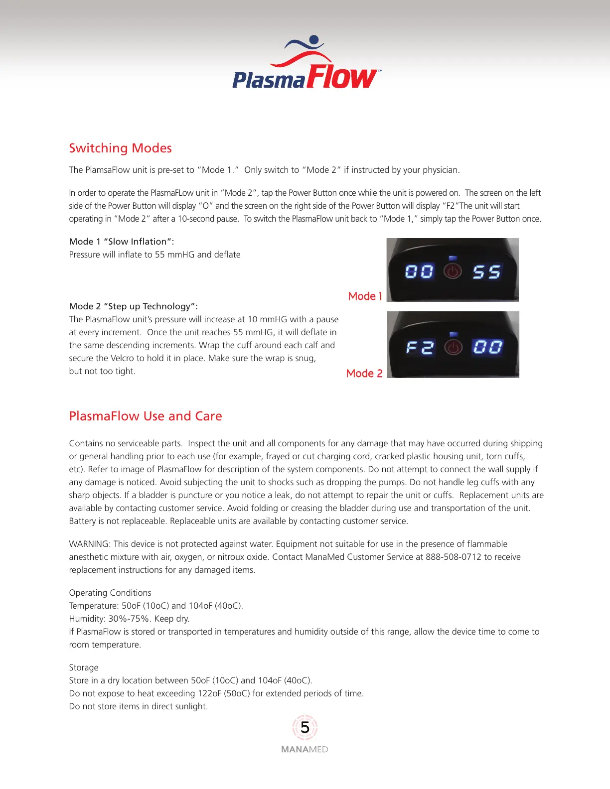 The PlamsaFlow unit is pre-set to “Mode 1.” Only switch to “Mode 2” if instructed by your physician.