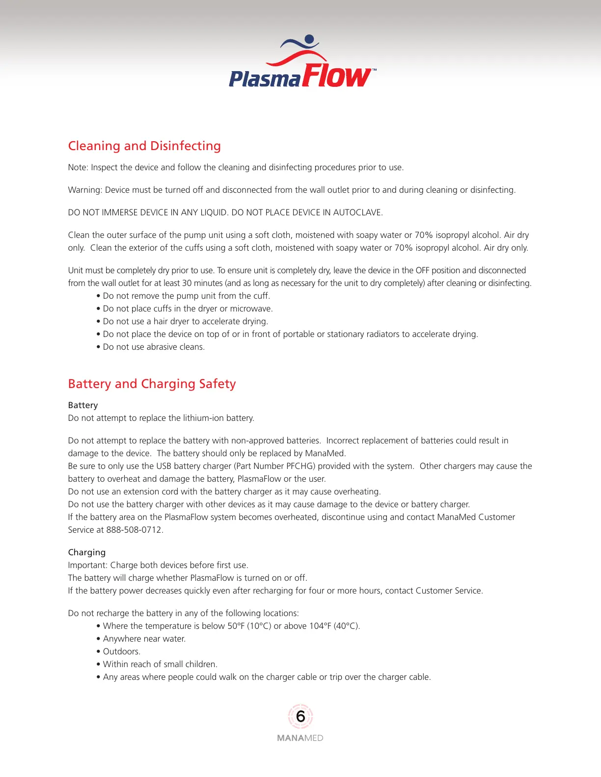 If the battery area on the PlasmaFlow system becomes overheated, discontinue using and contact ManaMed Customer