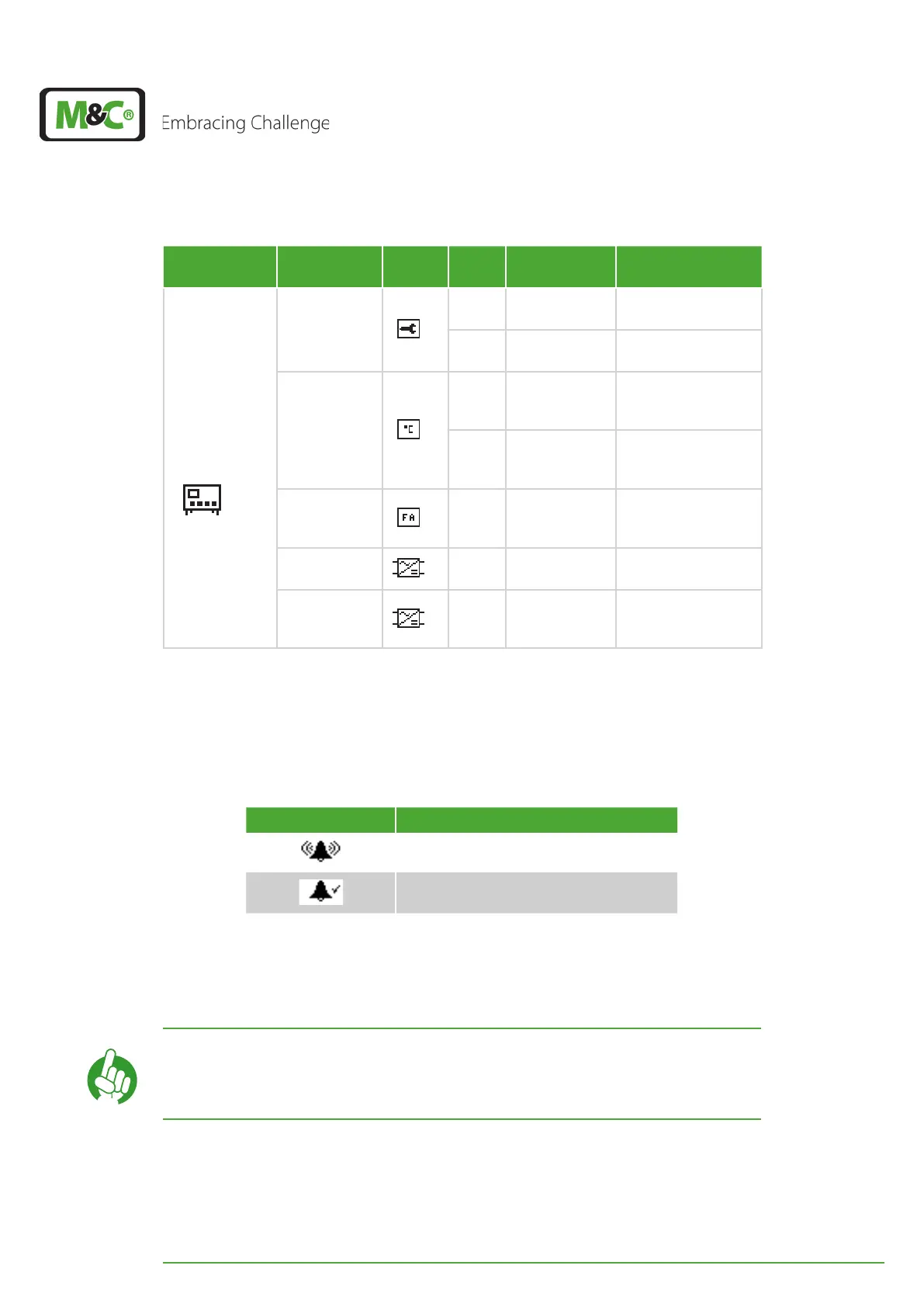 The following table shows the symbols that can occur in case of an alarm, and explains