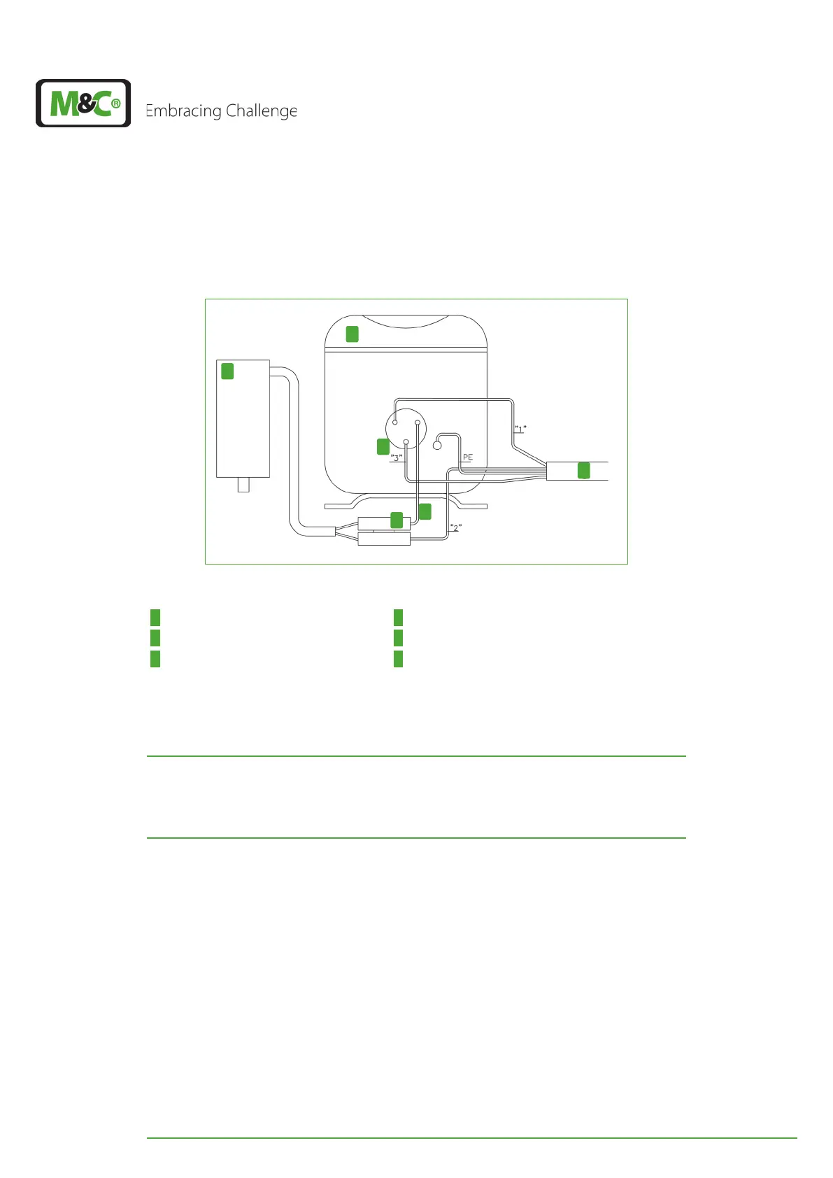 The four wires of the compressor unit are marked with the numbers ‘1’‚ ‘2’, ‘3’ and the letter