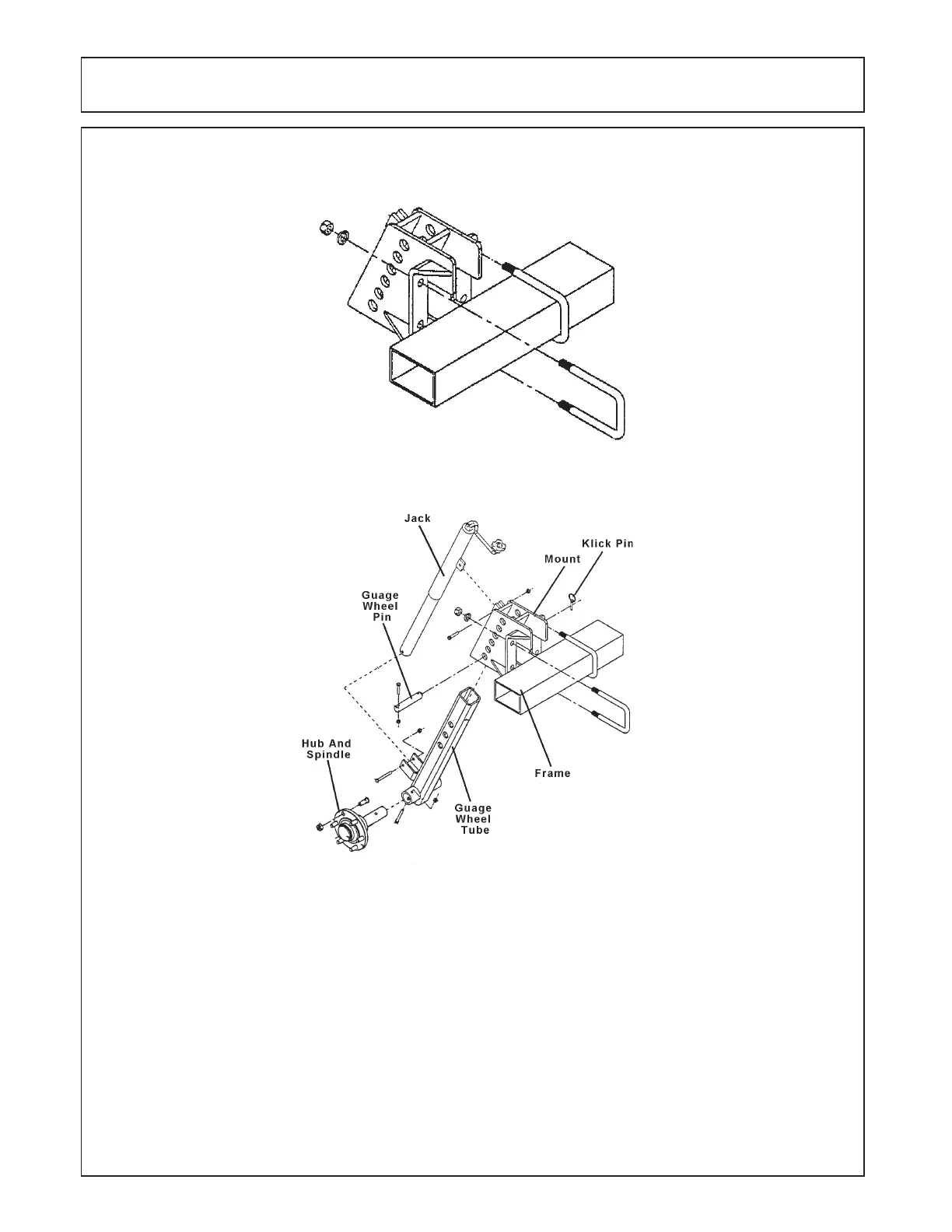 2. Install the gauge wheel tube and pin the tube in place. Place one 3/8” x 1-3/4” bolt and locknut in end of the