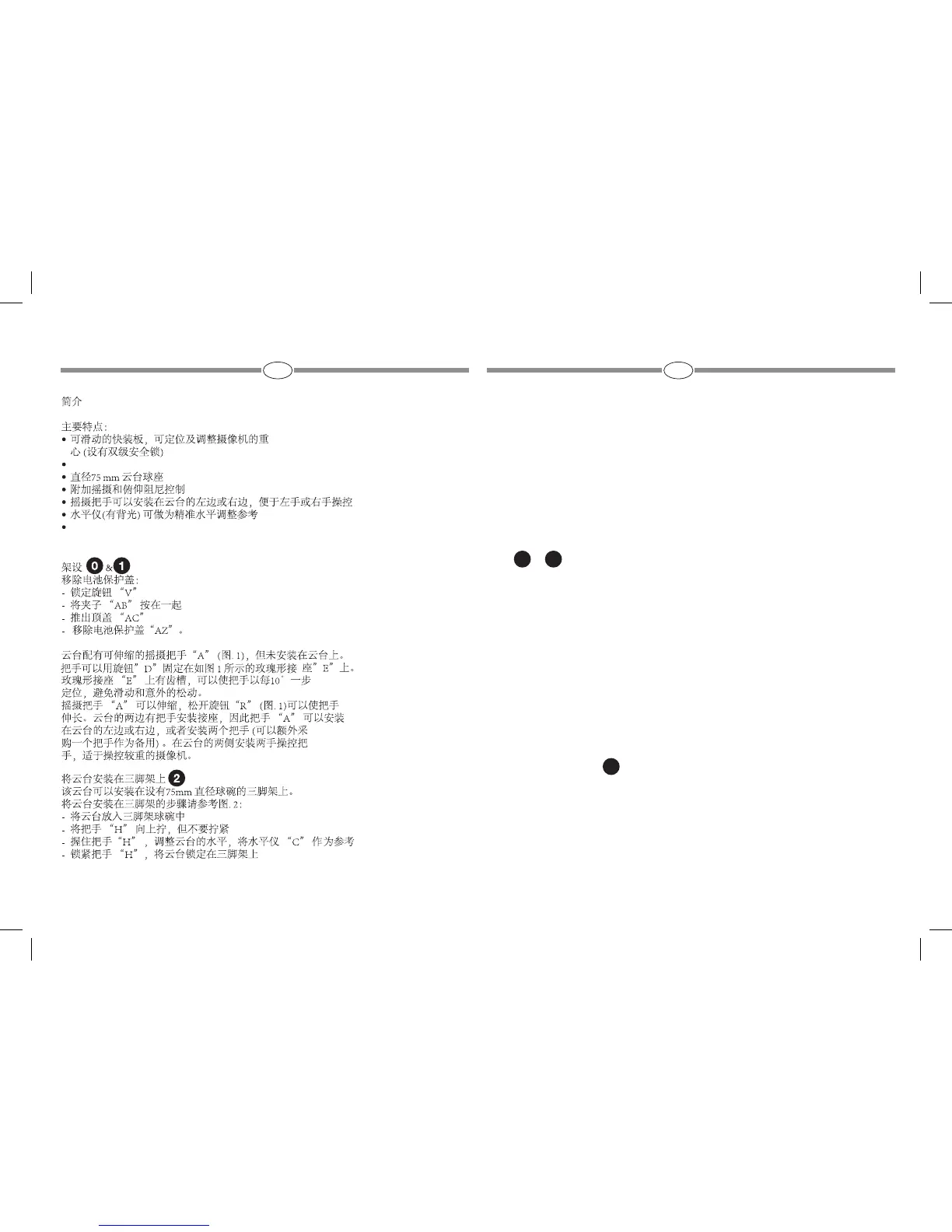- 그립 "H"를 잡고 스피리트 레버 "C"를 사용하여 삼각대 헤드의 수평을 잡으십시오