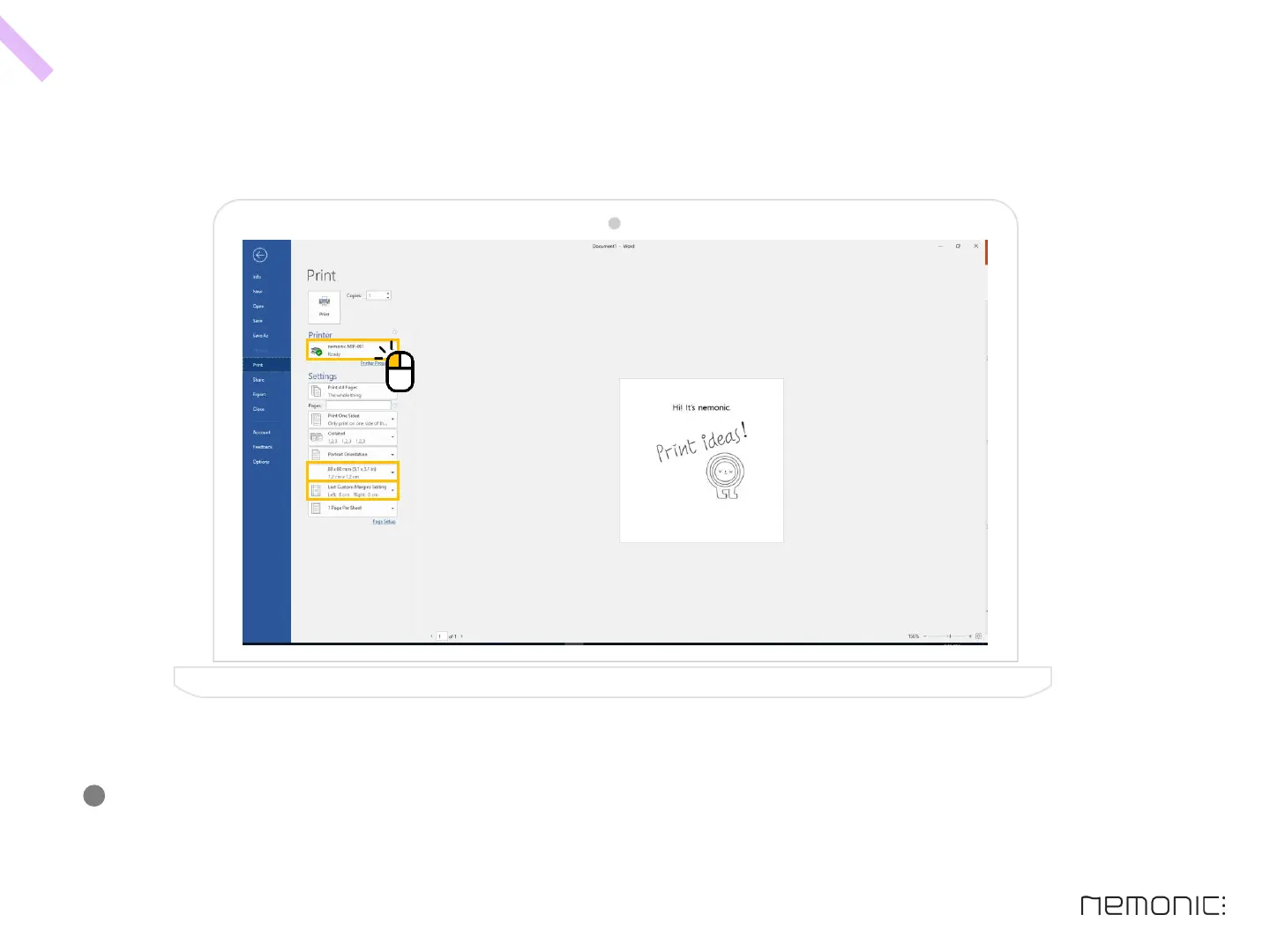 At the print preview, select nemonic MIP-001 as printer, set paper size as 80x80mm and set all margin to 0.