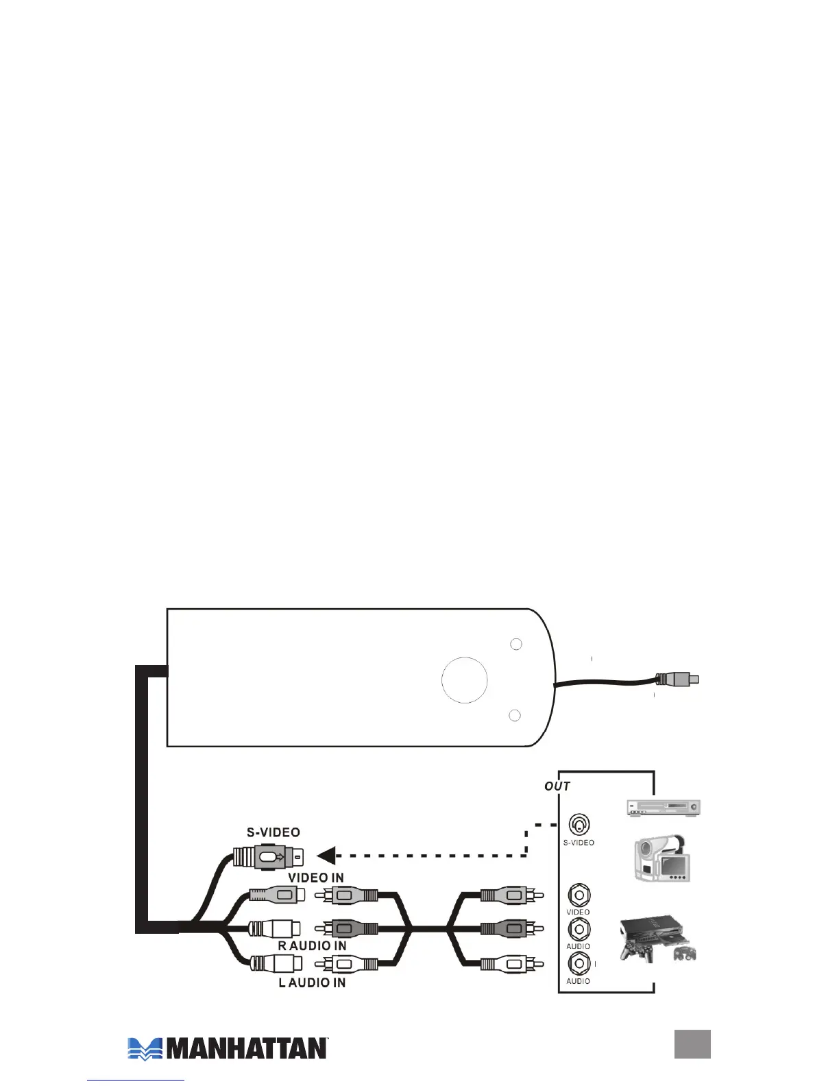 camcorder, VCR, TV or other media device equipped with S-video or RCA outputs. A single-