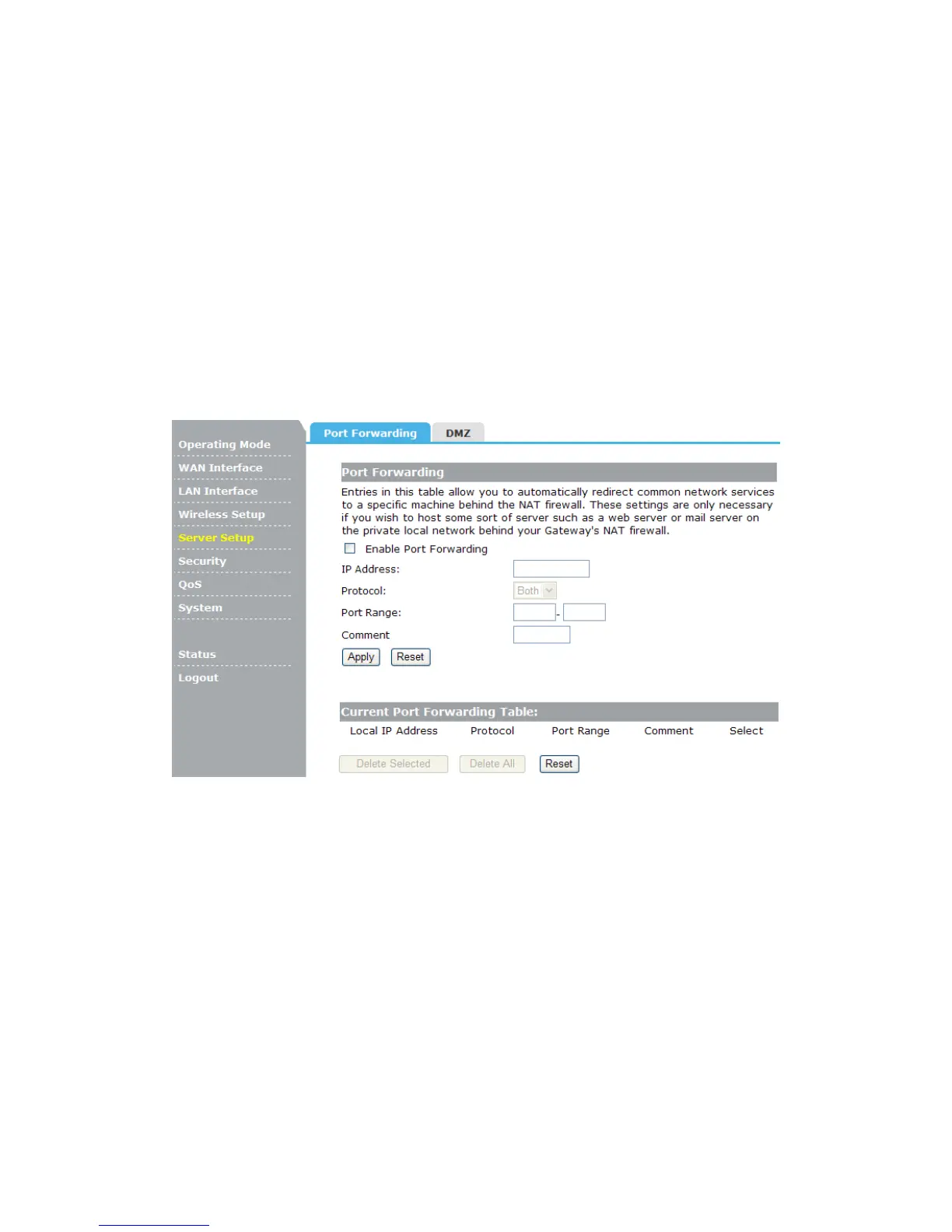 There are two submenus under the Server Setup menu: Port Forwarding, DMZ. Click