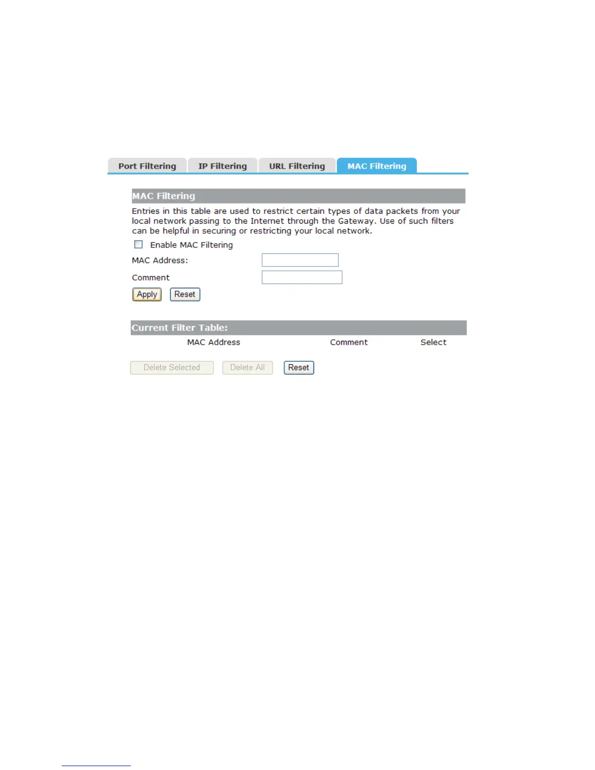 The MAC Filtering feature allows you to control access to the Internet by users on your