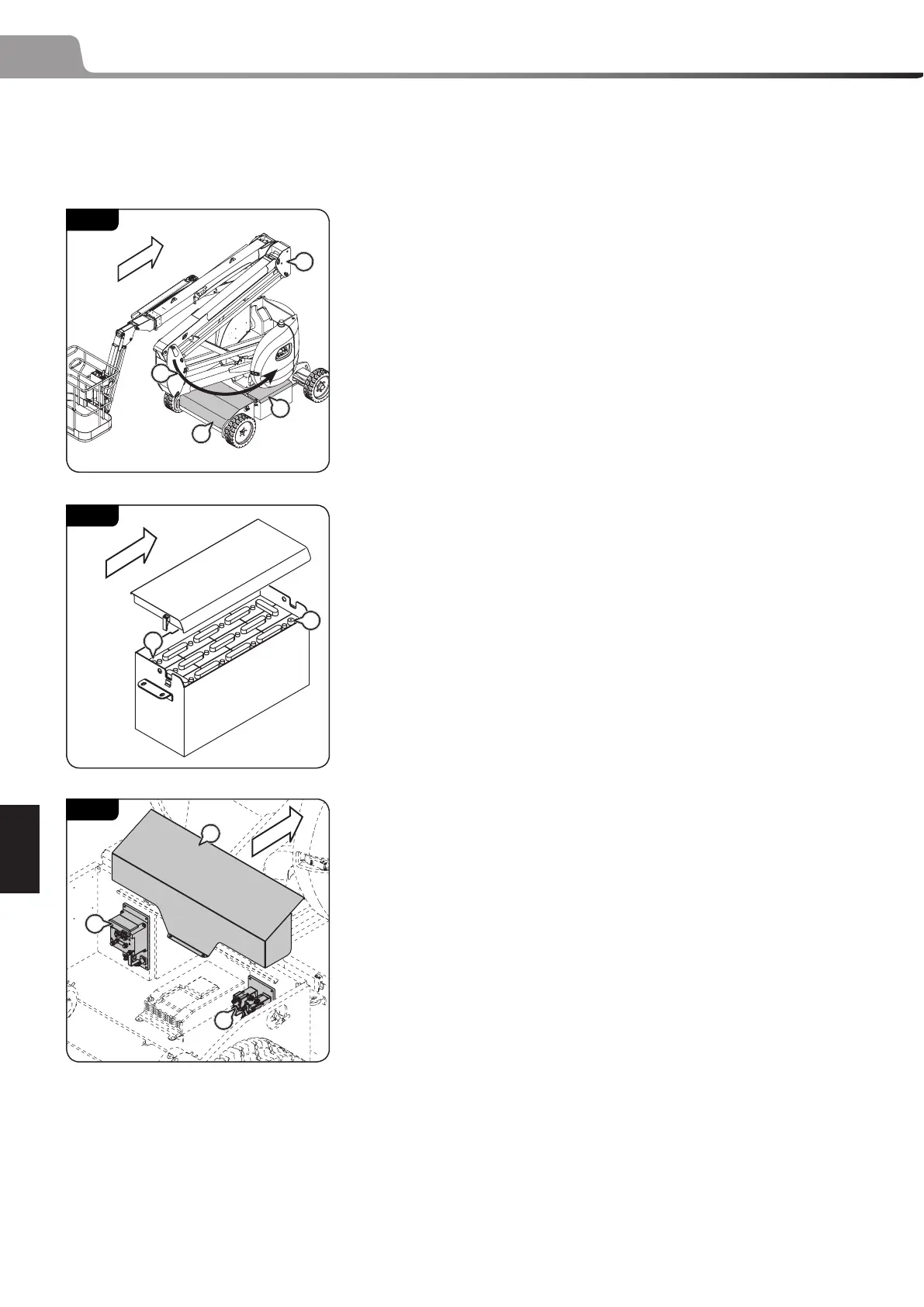 - Raise arm 1/2 so that the upper hinge (1, 080 - 120) is raised by