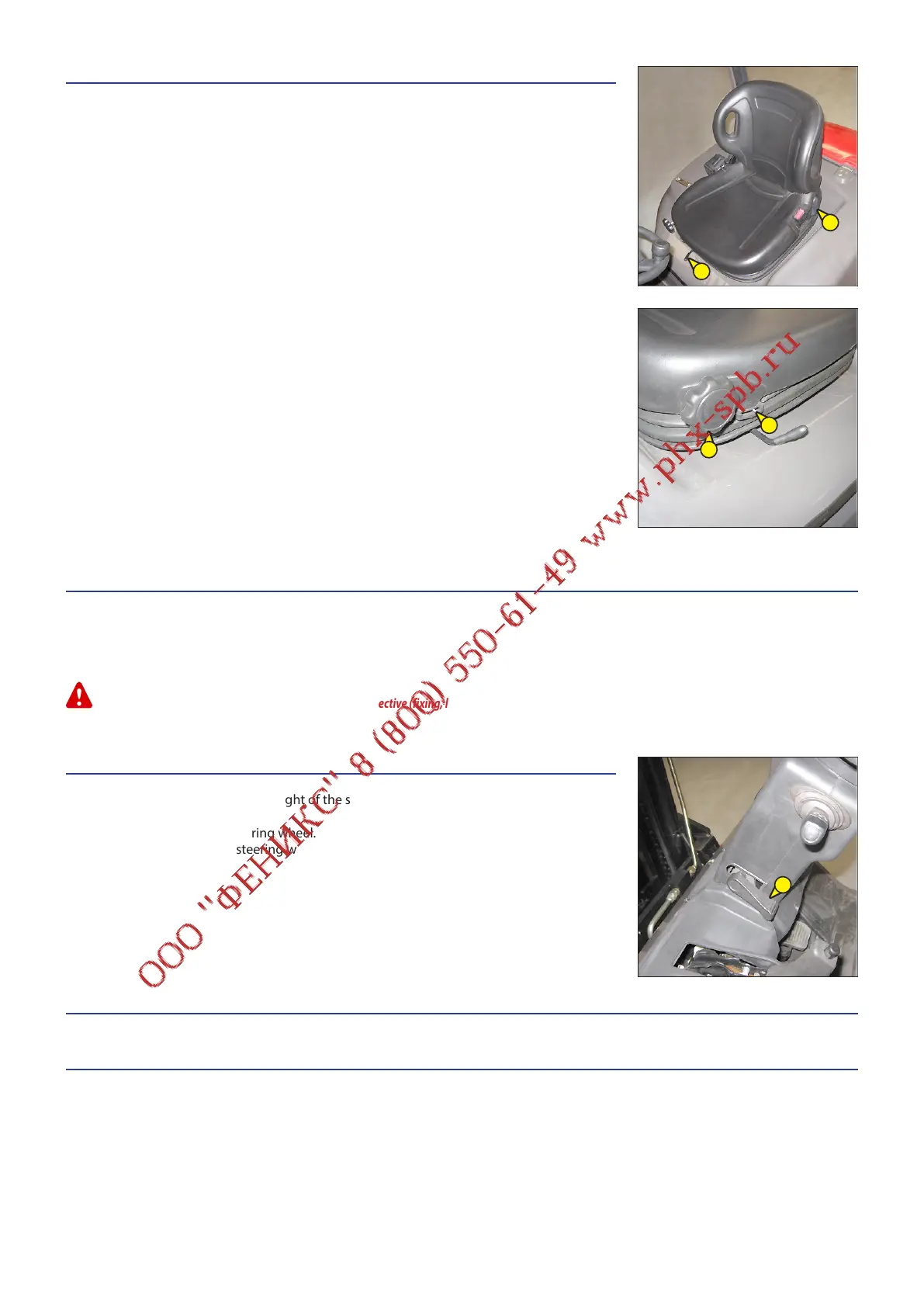 In no event should the lift truck be used if the seat belt is defective (fixing, locking, cuts, tears, etc.). Repair or replace the seat belt immediately.