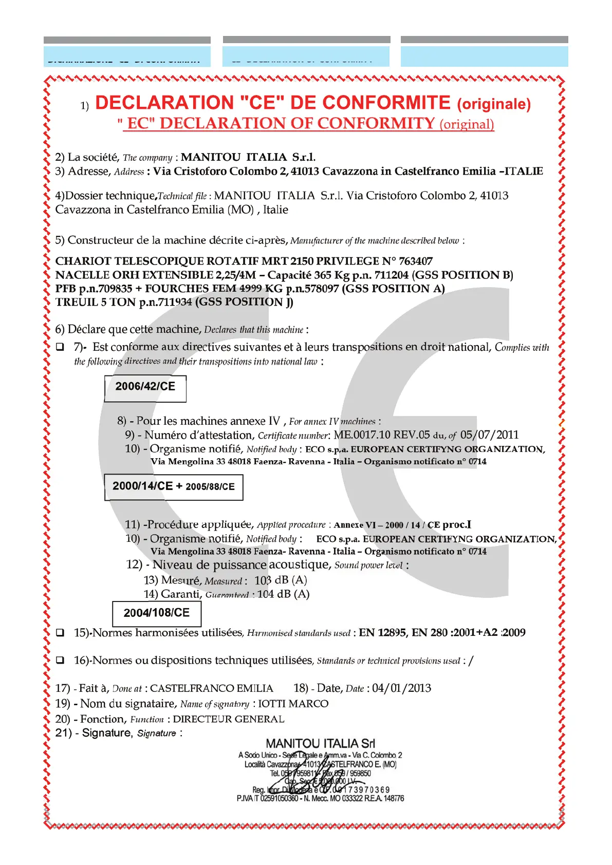 1) DECLARATION "CE" DE CONFORMITE (originale)