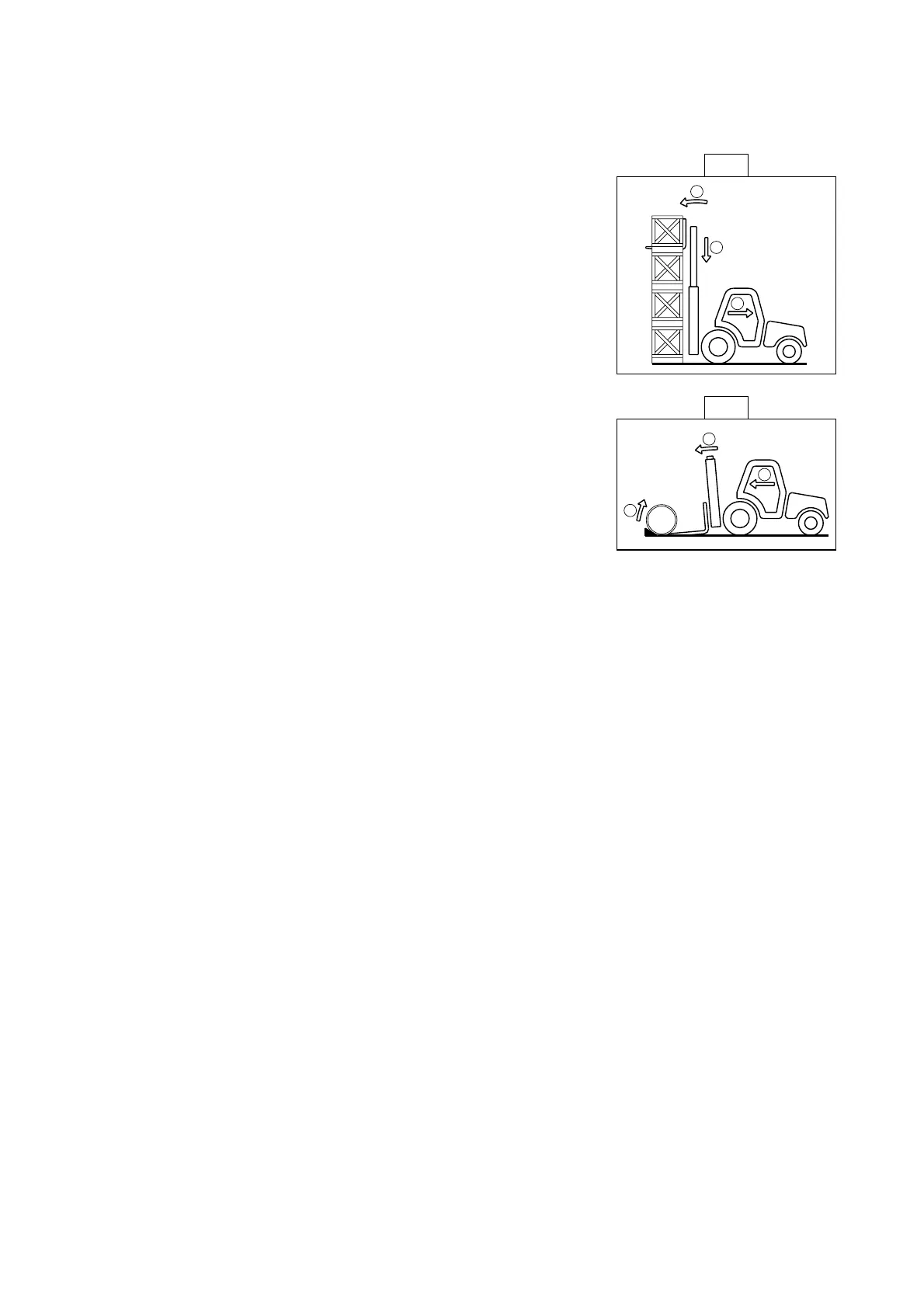 - Tilt the carriage (1) forwards and move the lift truck forward (2) while