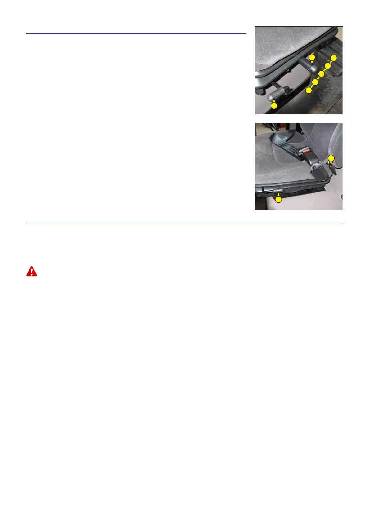 In no event should the lift truck be used if the seat belt is defective (fixing, locking, cuts, tears, etc.). Repair or replace the seat belt immediately.