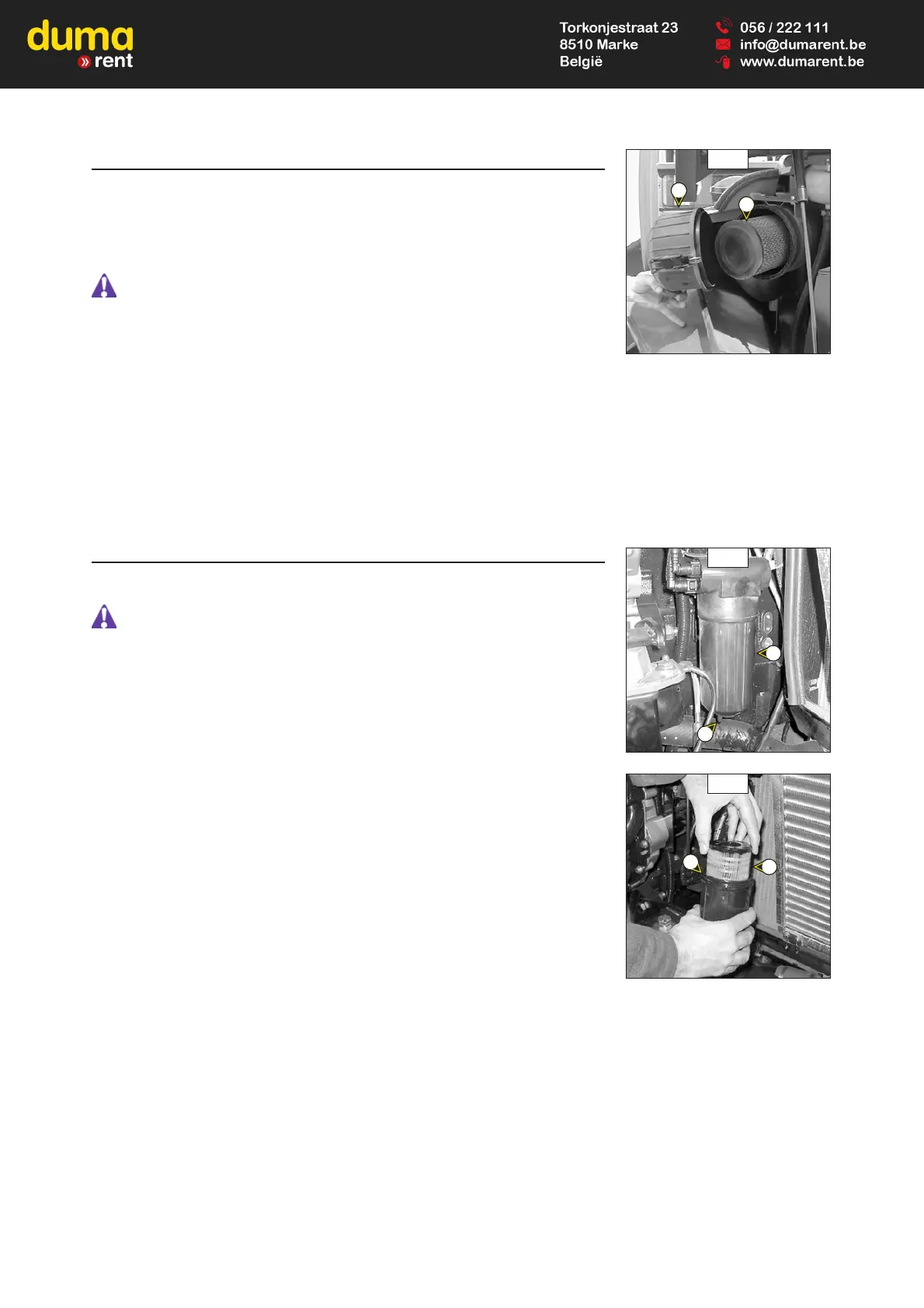 - Check pipes and connections between the air filter and the I.C. engine and the connection and state of the clogging indicator on
