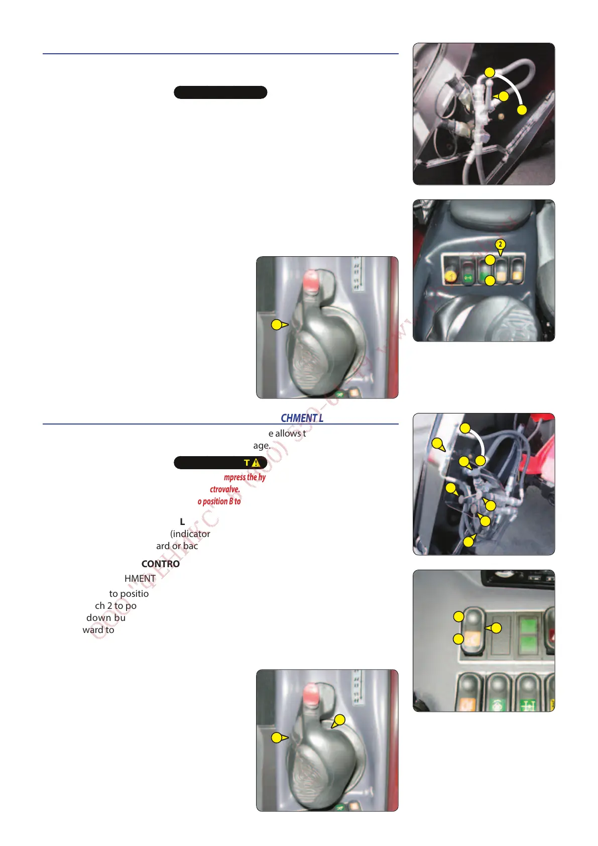 For ease of connection of the quick-release couplers, decompress the hydraulic circuit by pressing button 1 on the