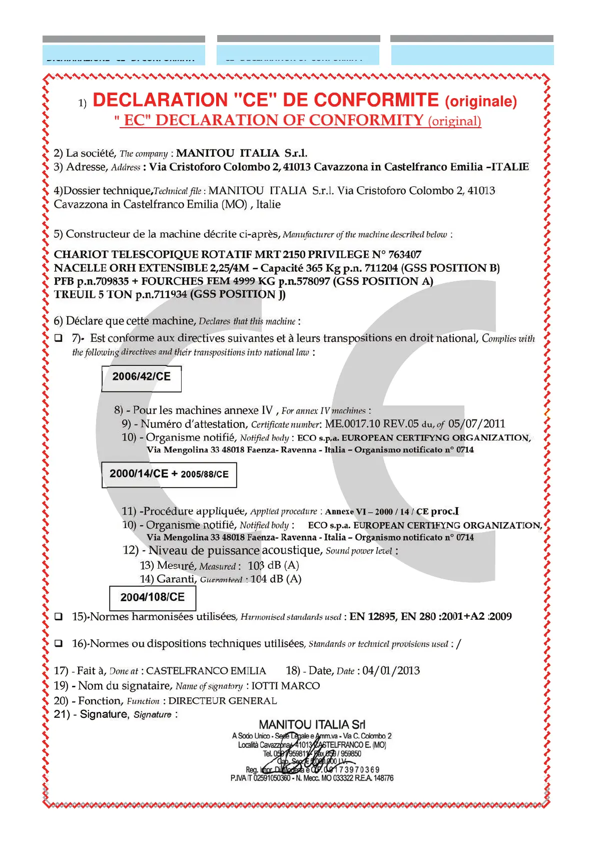 1) DECLARATION "CE" DE CONFORMITE (originale)