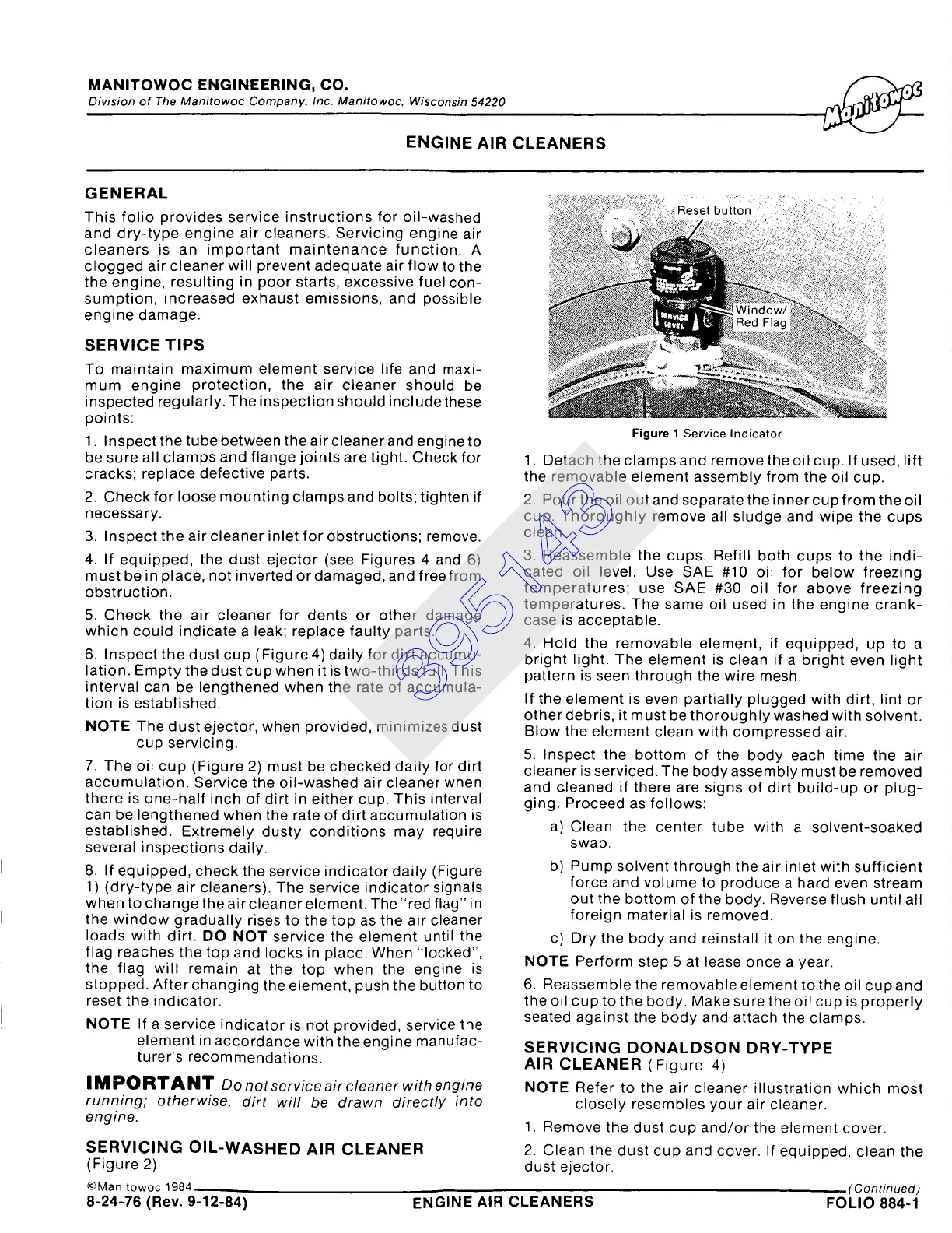 and dry-type engine air cleaners. Servicing engine air