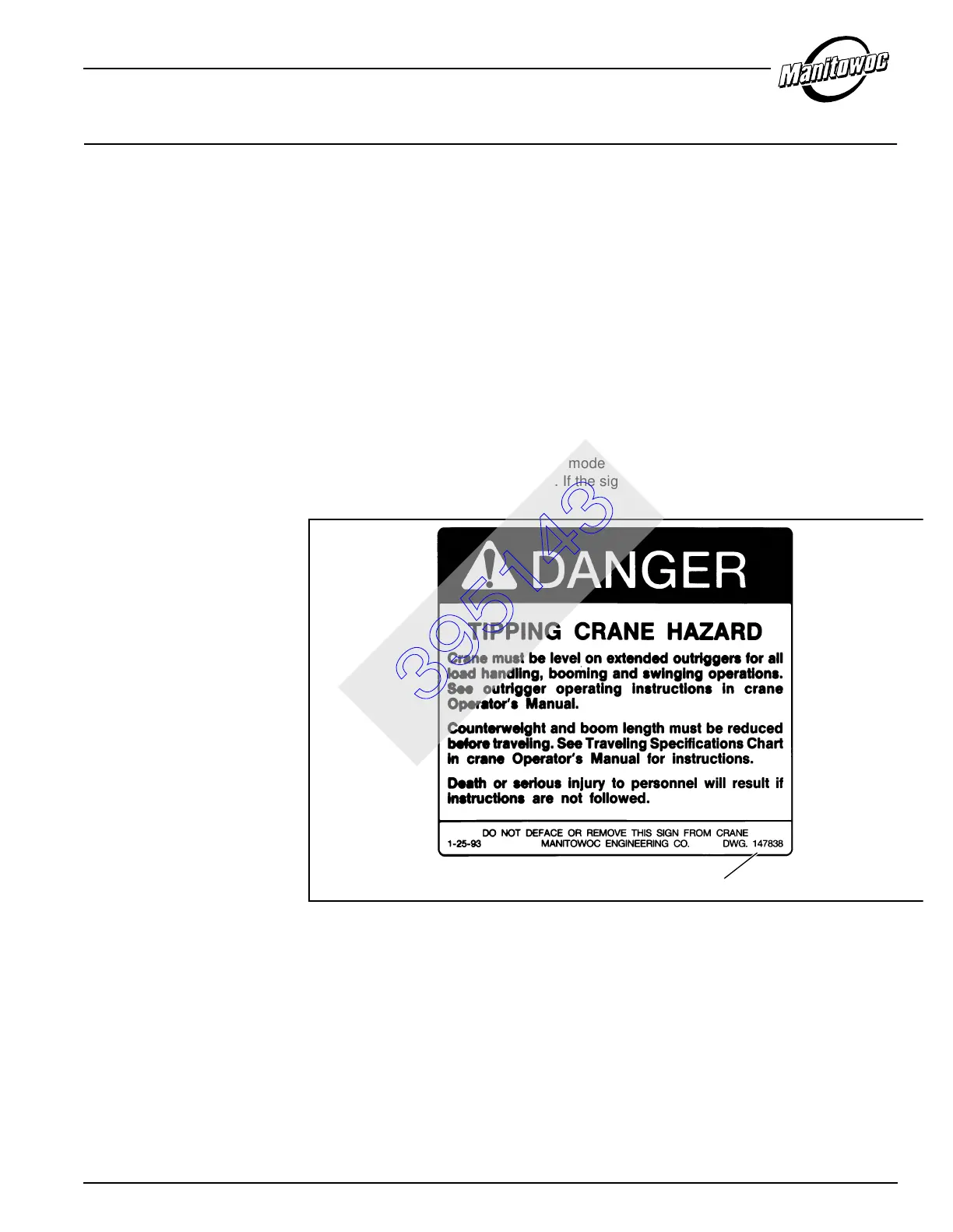 Order replacement signs from your local Manitowoc Dealer or from the factory at the fol-
