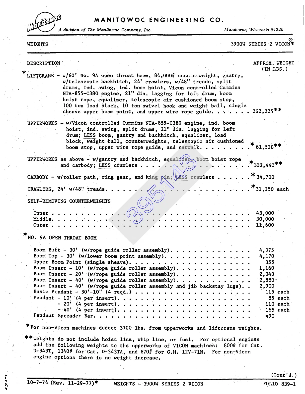 10-7-74 (Rev, iI-29-77)~ WEIGHTS -3900W SERIES 2 VICON-