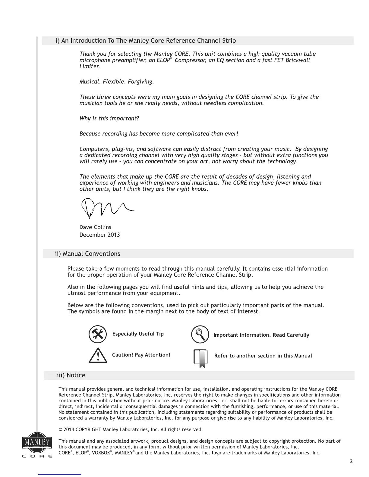 Manley CORE - Introduction and Manual Information; An Introduction to the Manley CORE; Manual Conventions Explained