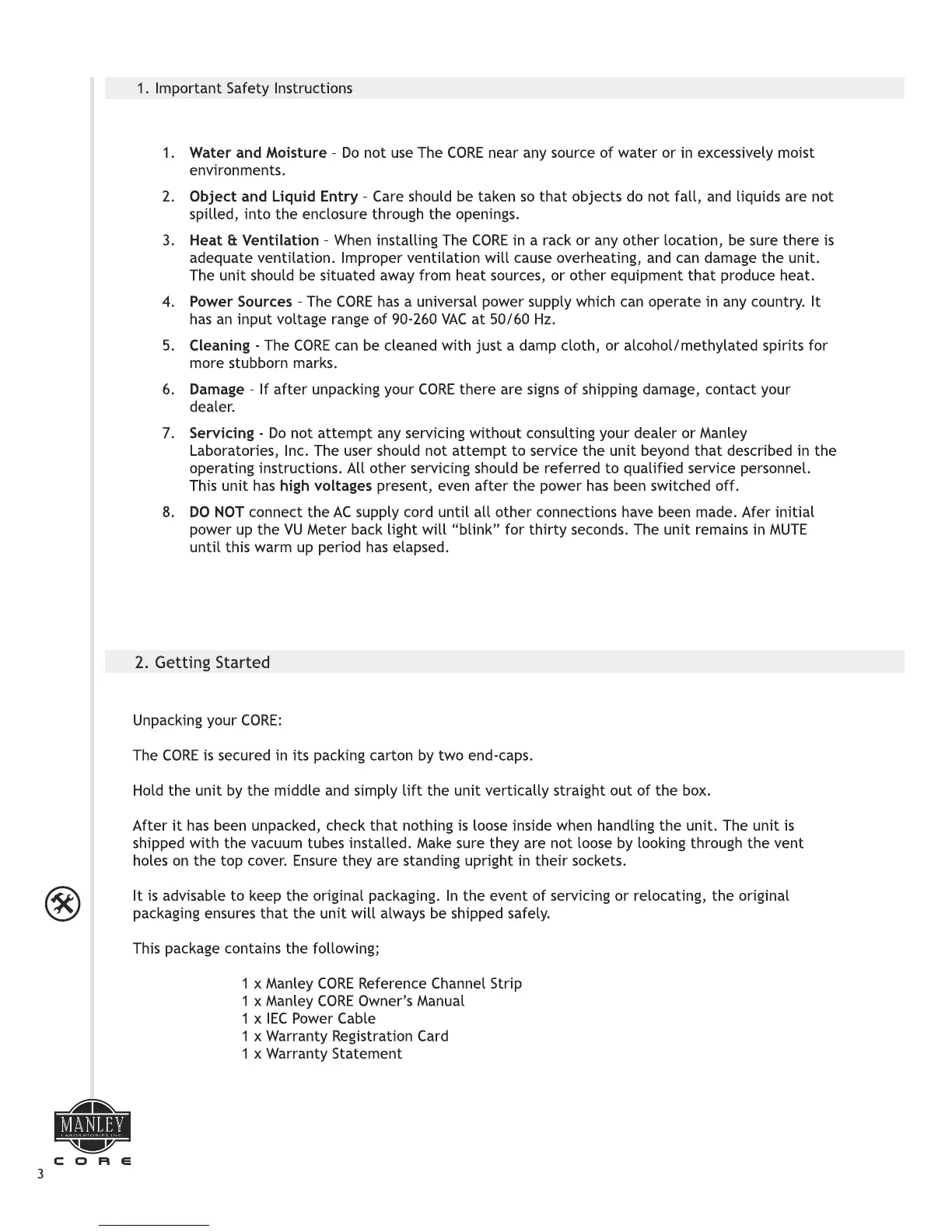 Manley CORE - Safety and Initial Setup; Important Safety Instructions; Getting Started Guide