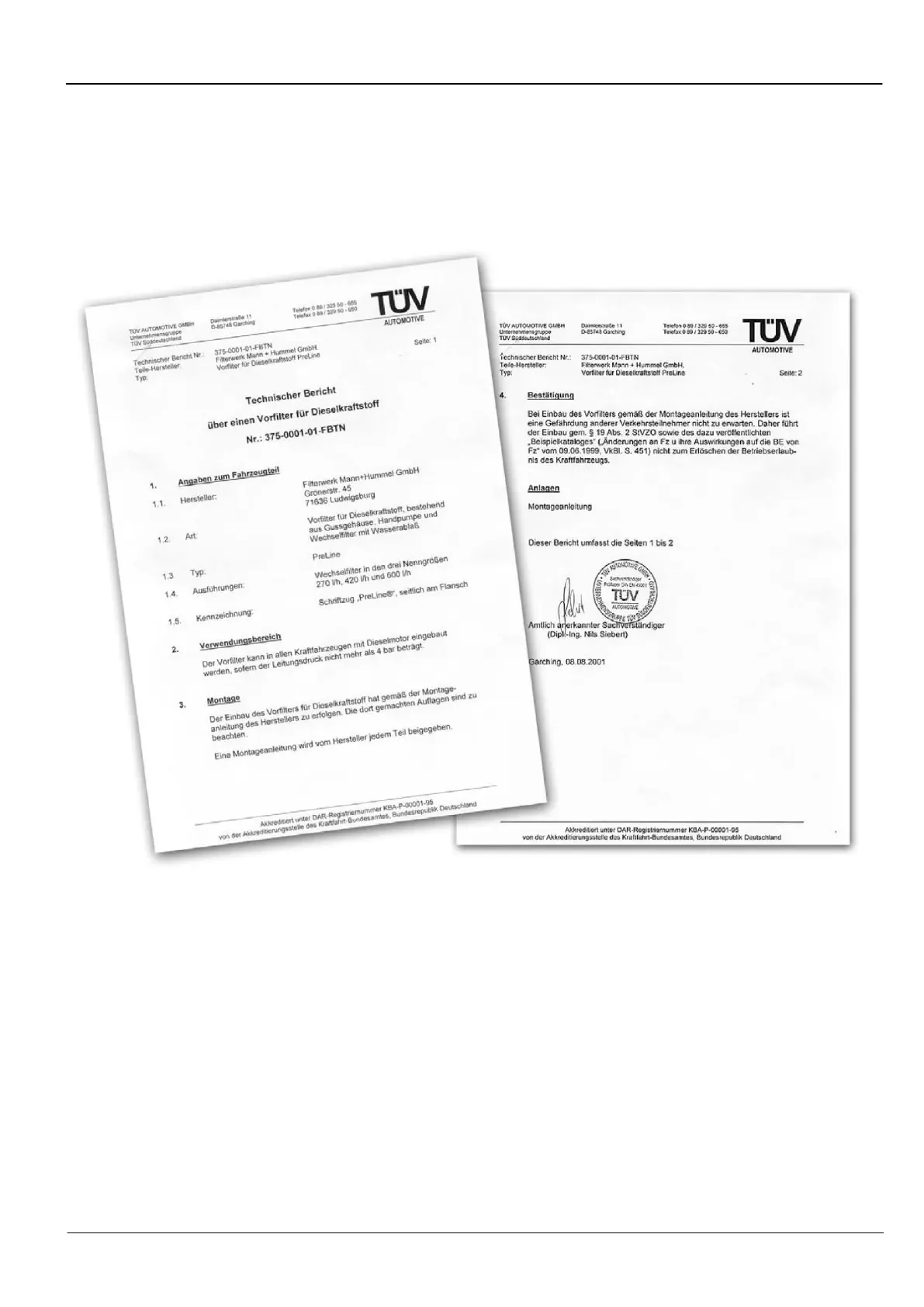 Le « Rapport technique sur un préfiltre pour gazole n°: 375-0001-01-FBTN » du TÜV (ass. ce