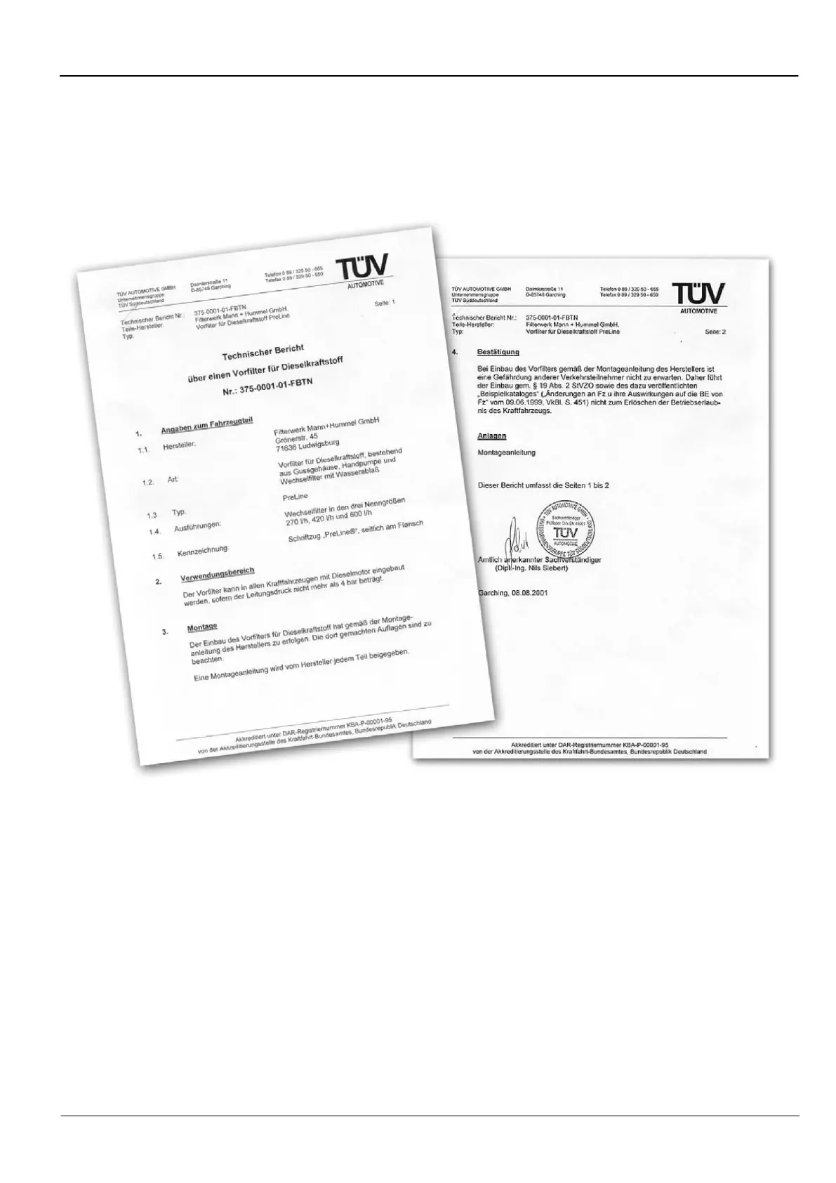 L'idoneità dell'uso del sistema di filtraggio PreLine in veicoli a motore è stata dichiarata nella "