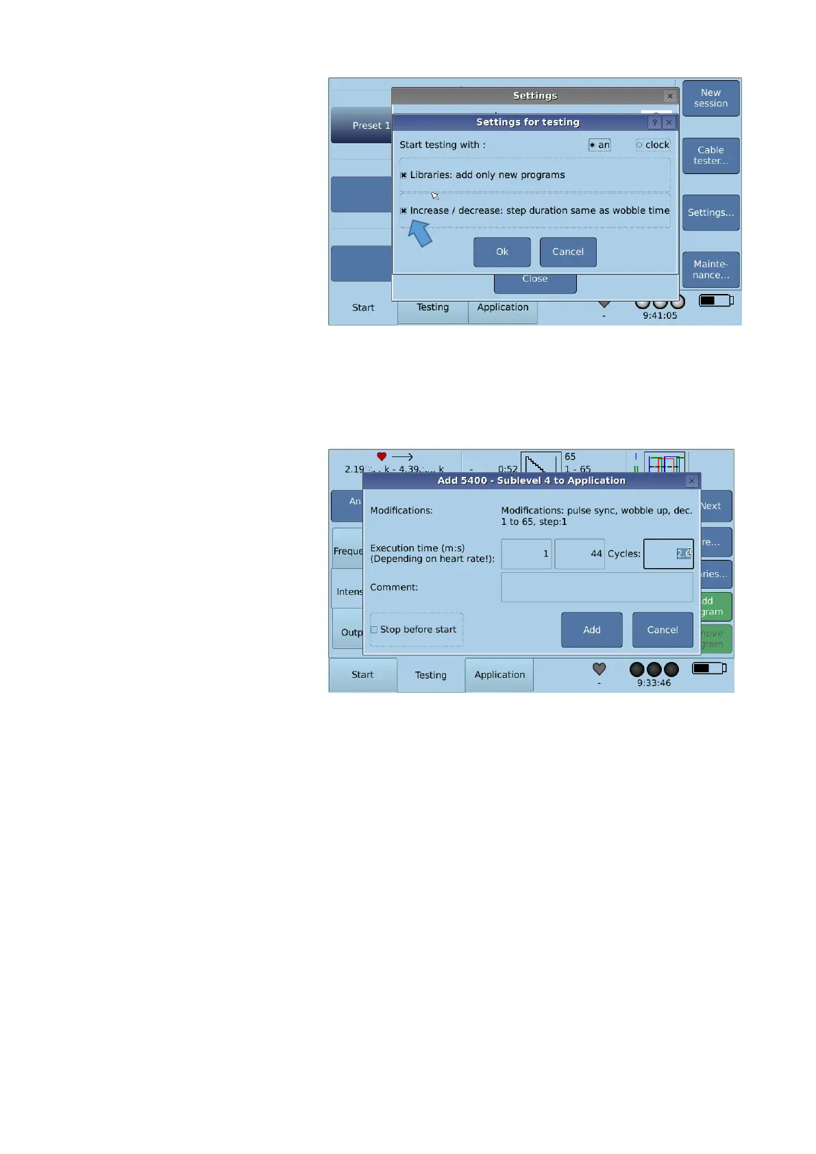 the Testing screen and step duration is synchronized with heart rate and wobble time