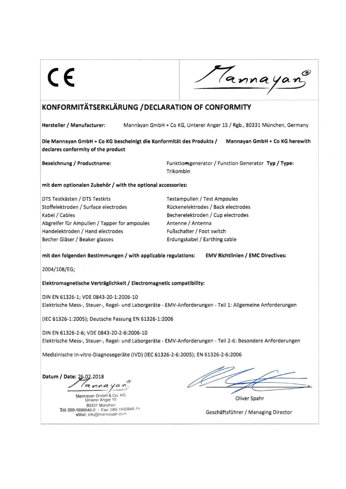 Mannayan Trikombin - Declaration of Conformity and Accessories; Declaration of Conformity; Manufacturer Information; Compliance with Regulations