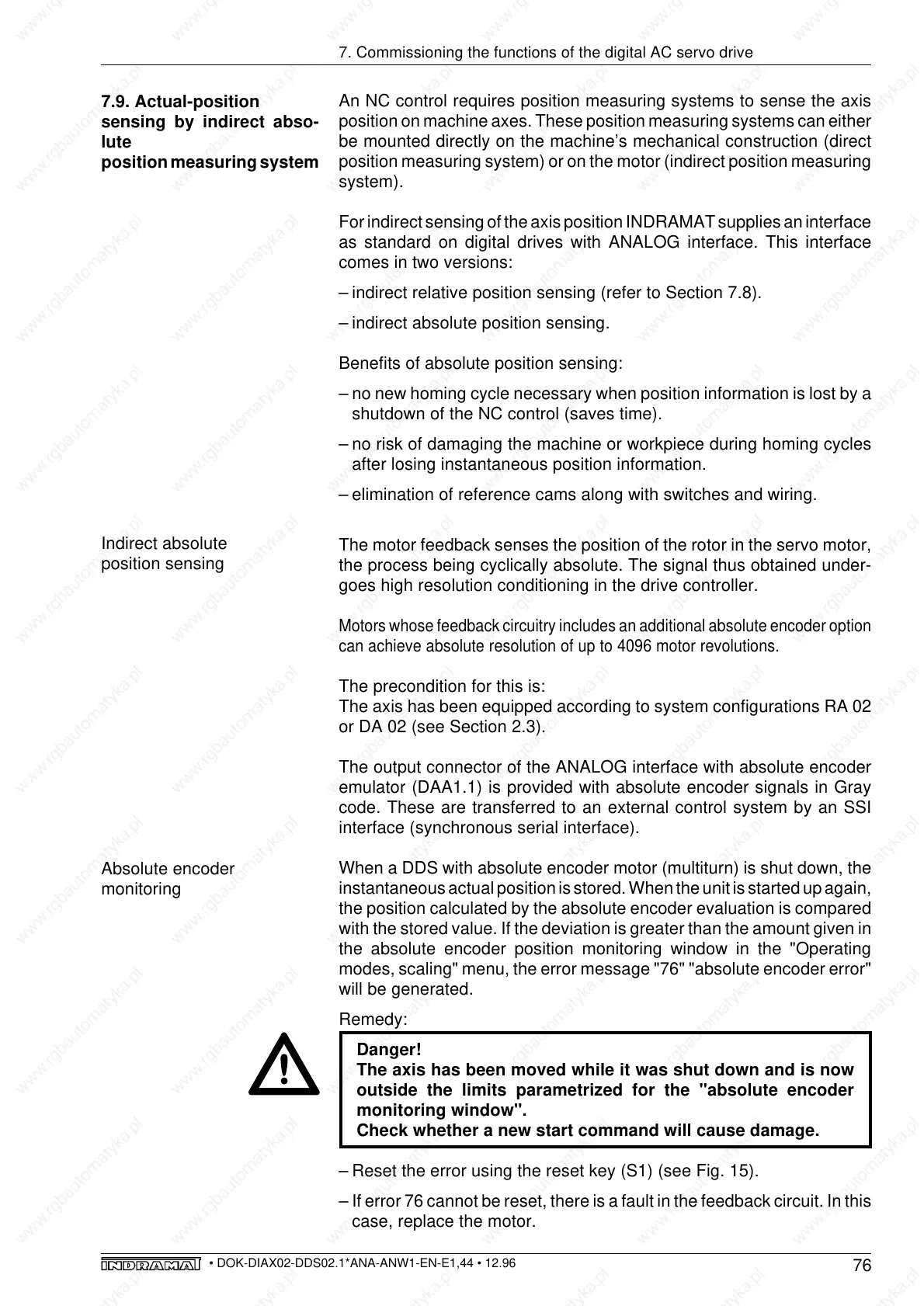 modes, scaling" menu, the error message "76" "absolute encoder error"