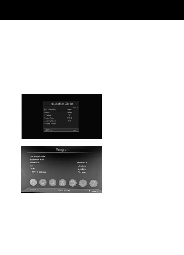 Ako uređaj koristite prvi put ili ako je vraćen na tvorničke postavke, izbornik vodiča za instalaciju