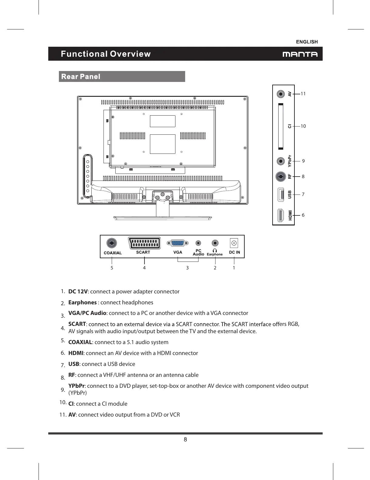 RF: connect aVHF/UHF antenna or an antenna cable