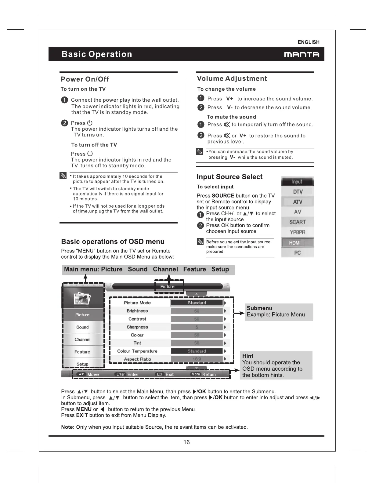 Manta LED2205 - Basic Operation; Volume and Input Source Control