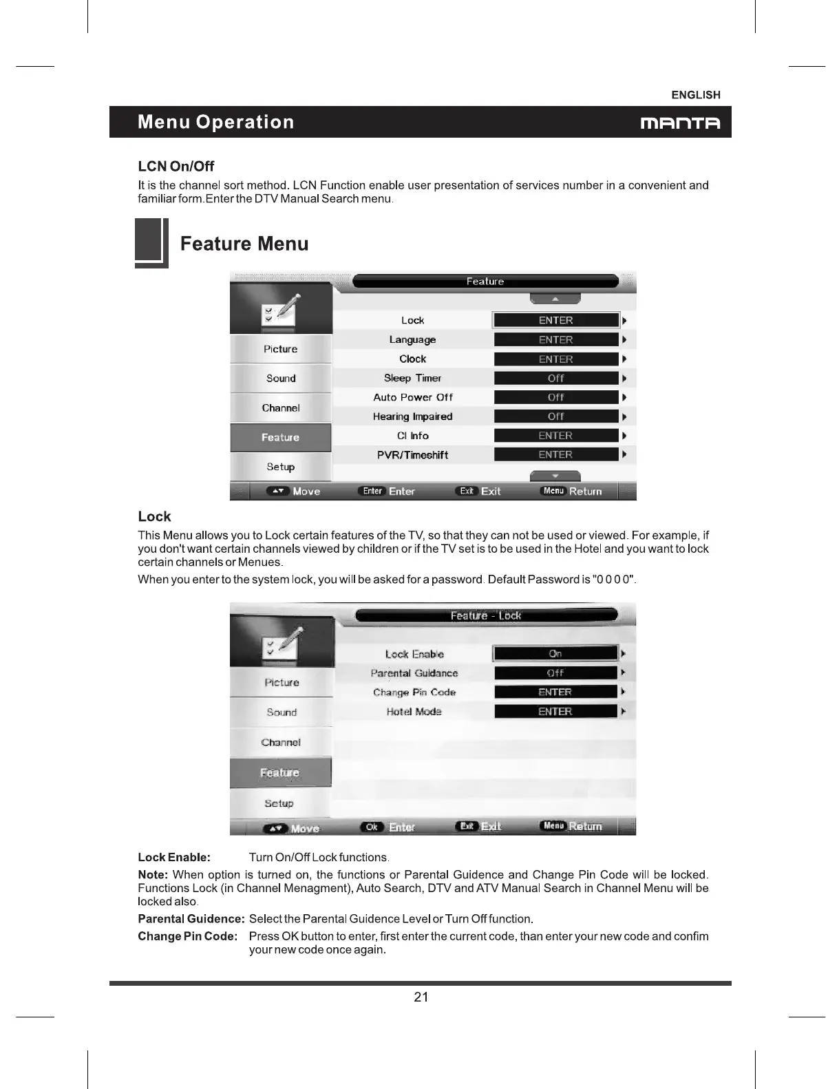 Manta LED2205 - Feature Menu and Lock Functions