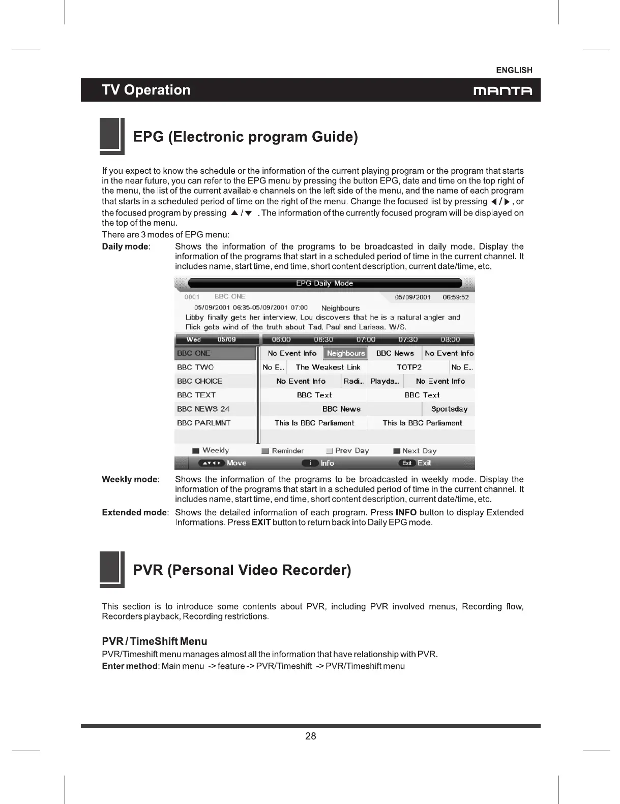 Manta LED2205 - PVR and TimeShift Functions; PVR;TimeShift Setup