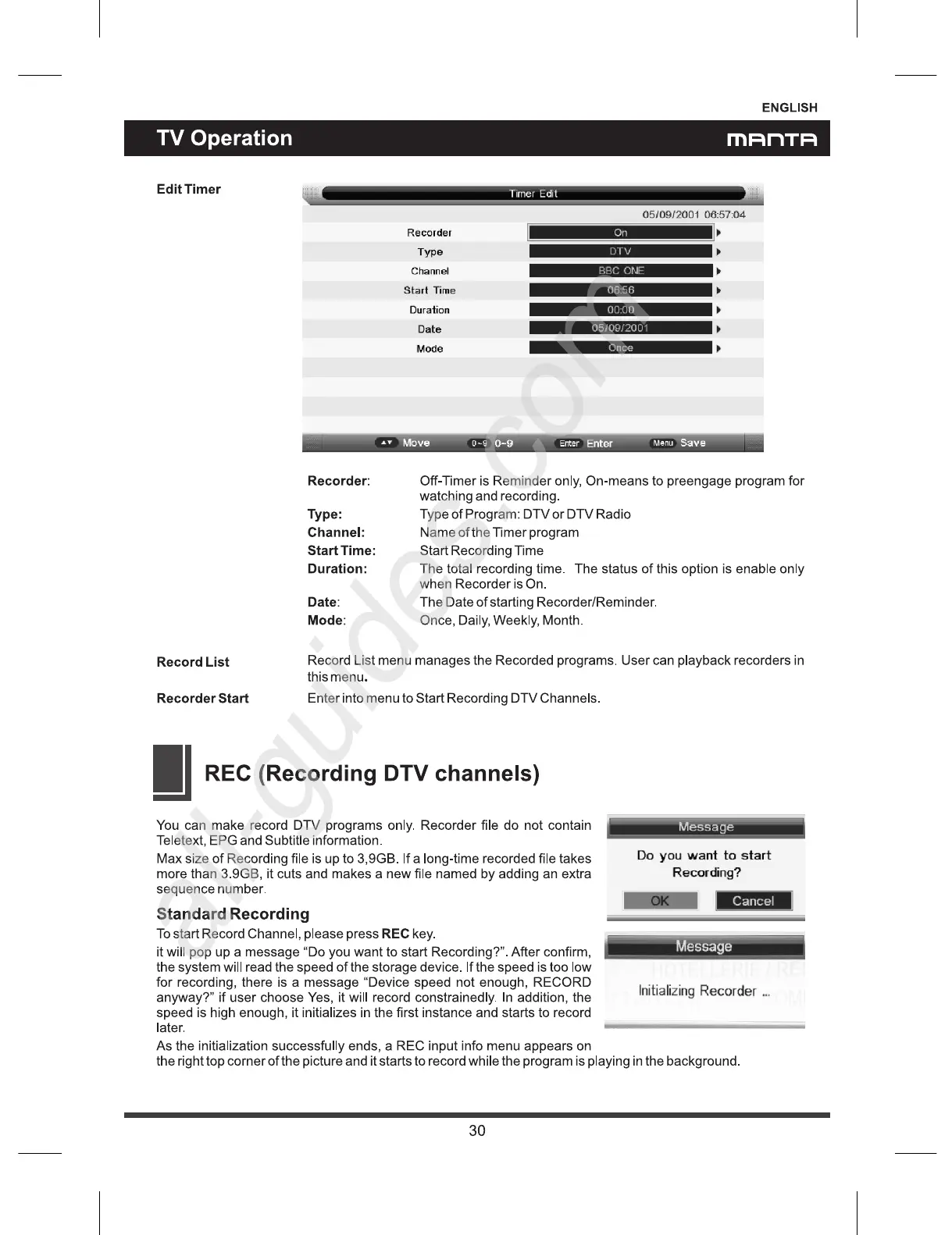 Manta LED2205 - Standard and EPG Recording Options; TimeShift Activation and Usage