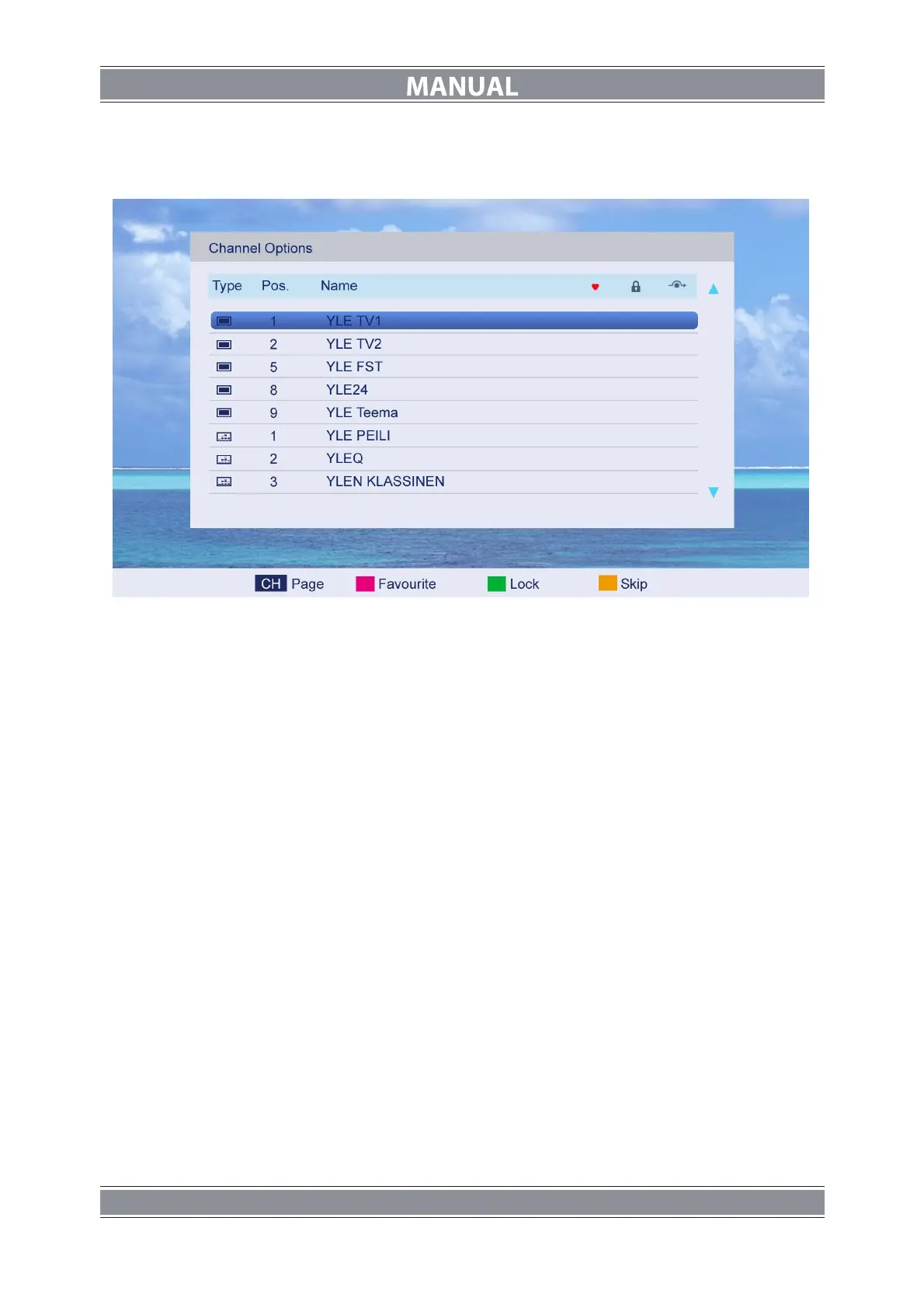 YELLOW button: Press this button to skip the channel, if the channels already skipped,
